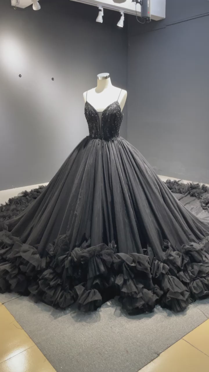 Black Ruffle Ball Gown Wedding Dresses Spaghetti Strap V-neck 222197