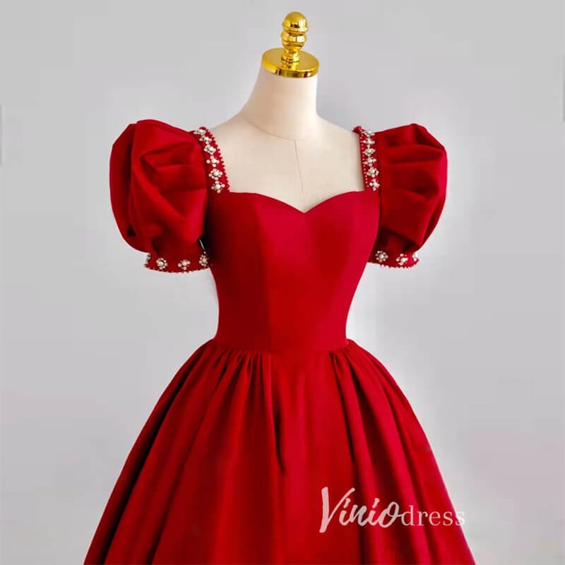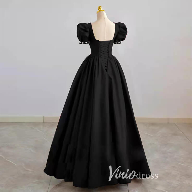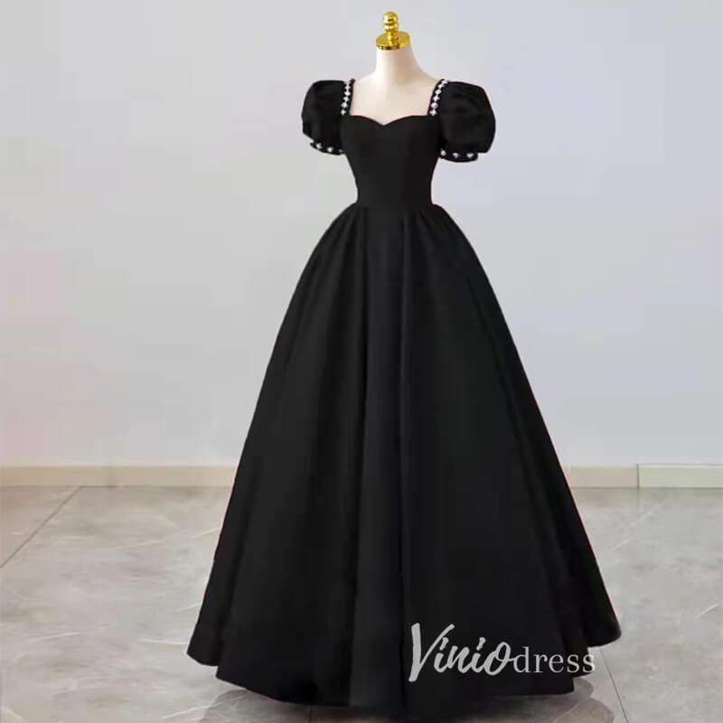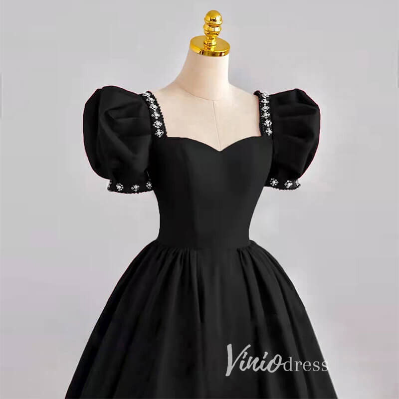 Black Satin Prom Dresses Puffed Sleeve Formal Gown FD3244