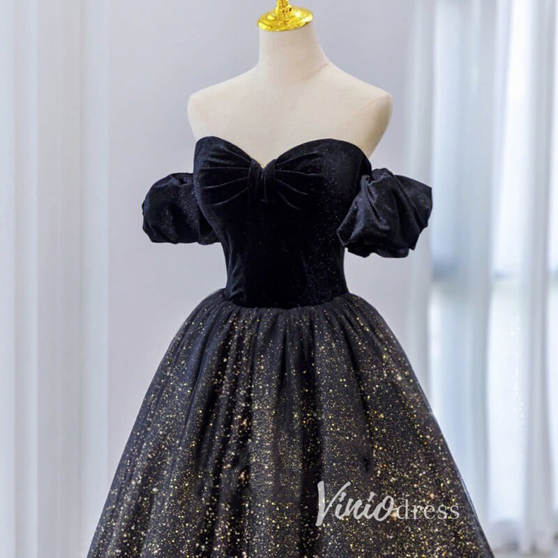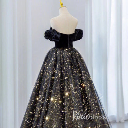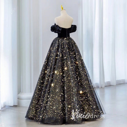 Black Sparkly Tulle Prom Dresses Off the Shoulder Formal Gown FD3241