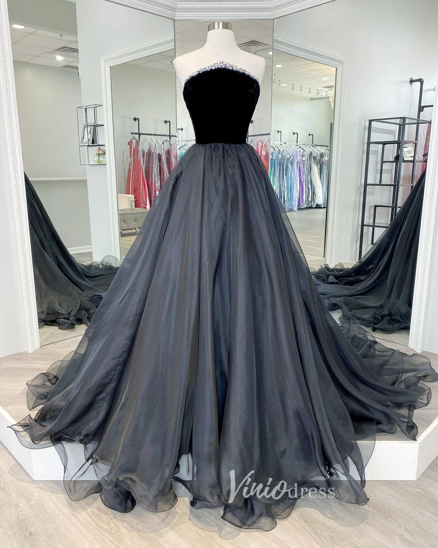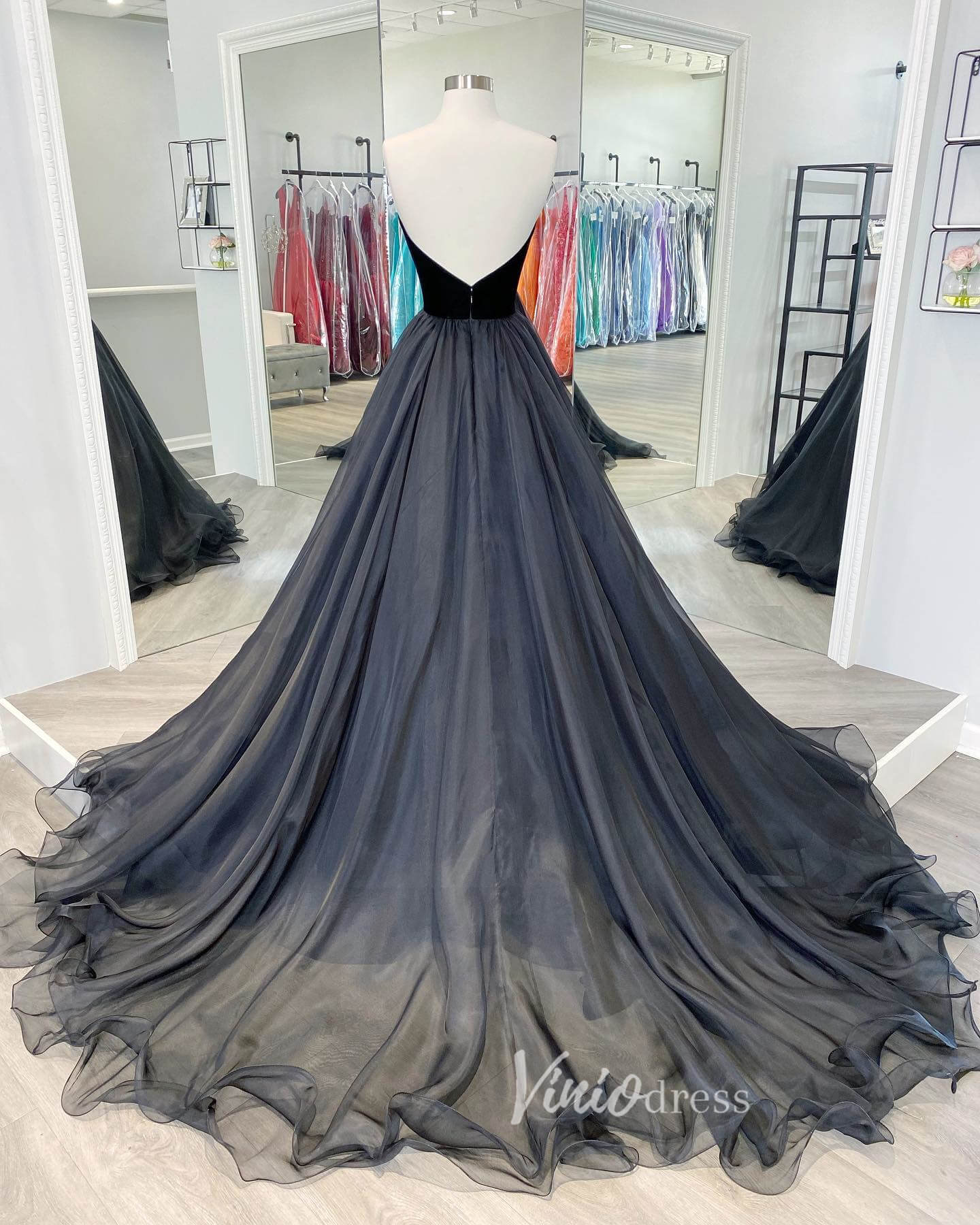 Elegant strapless prom dress features velvet bodice, organza bottom, court train.