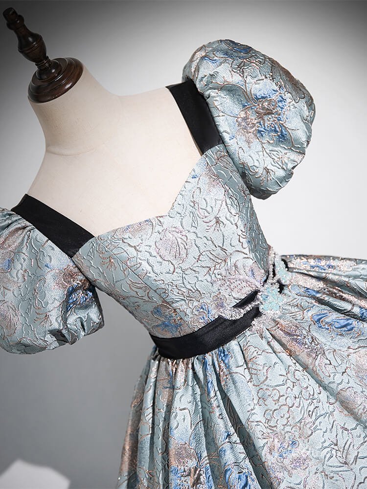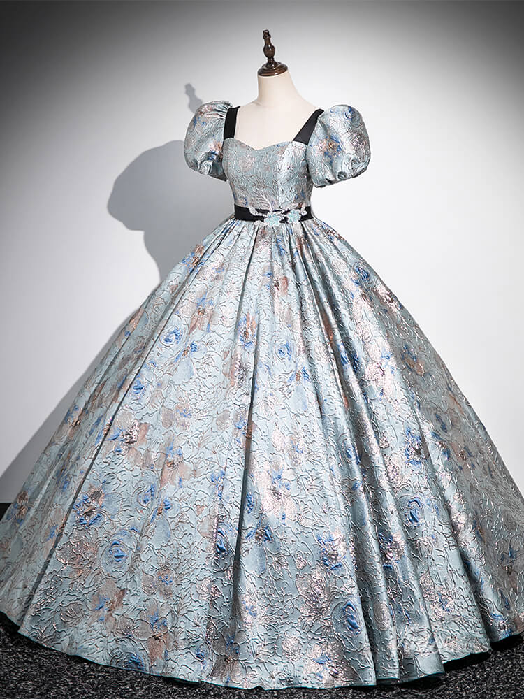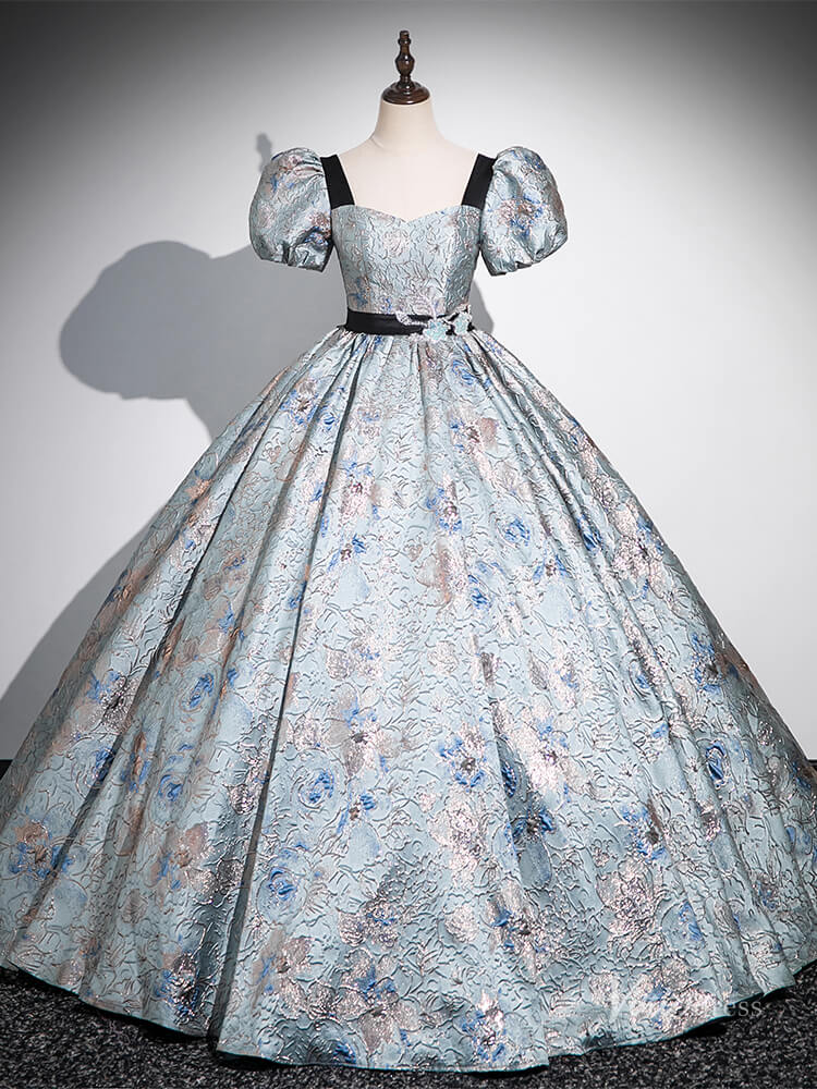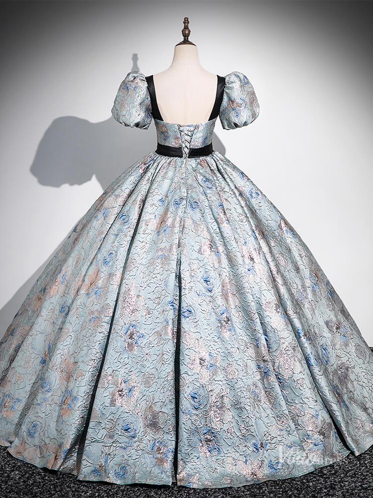 "Be the belle of the ball in our Blue Puffed Sleeve Jacquard Prom Ball Gown! The delicate jacquard fabric, puffed sleeves and sweetheart neck create a chic and elegant look, while the vibrant blue color adds a touch of glamour. Make a statement at your quinceanera and dazzle in this stunning dress!