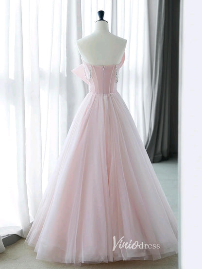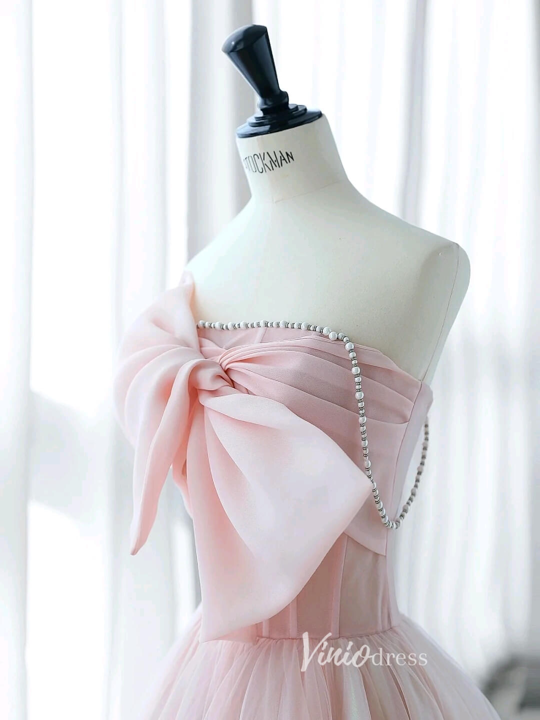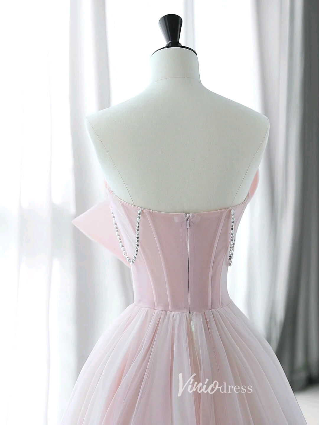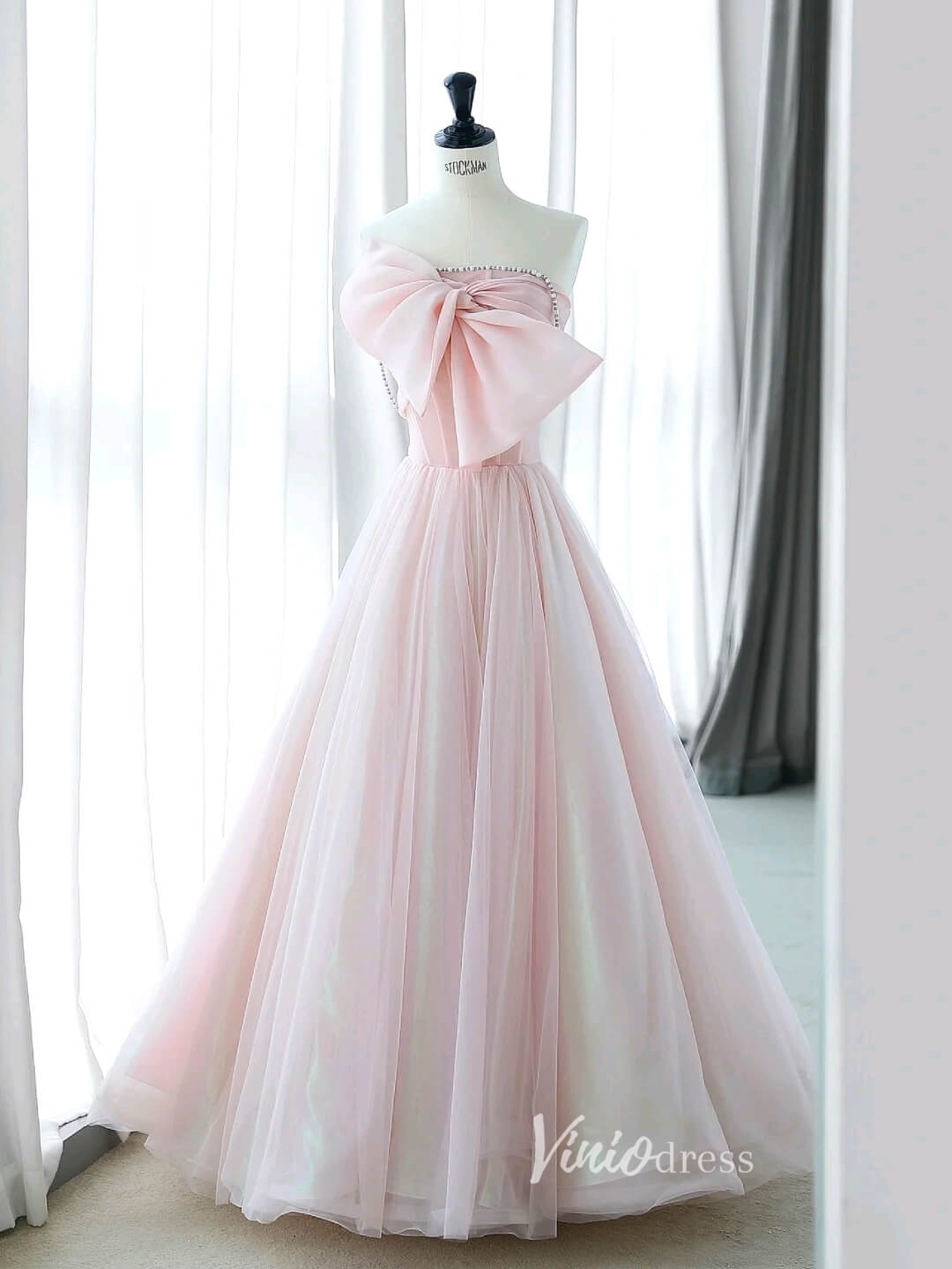 Stunning and sleek, this blush pink strapless formal dress brings luxury and style to the prom. Show off your sense of fashion with a bow-tie bodice and a timeless silhouette that will have you looking and feeling like royalty. Perfect for an unforgettable night out.