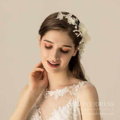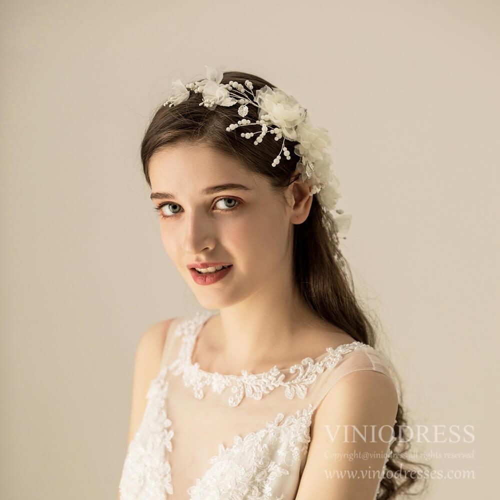 This whimsical wedding comb features ivory chiffon flowers with central designs of pearls, metal leaves extend from each flower.