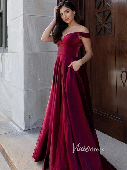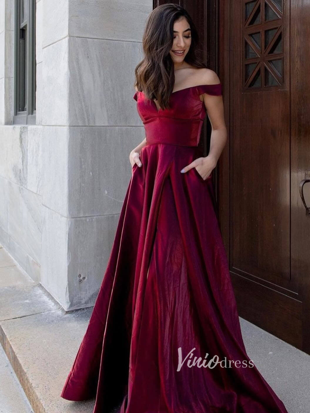 Burgundy Prom Dress with Pockets Shiny Satin Gown FD2712