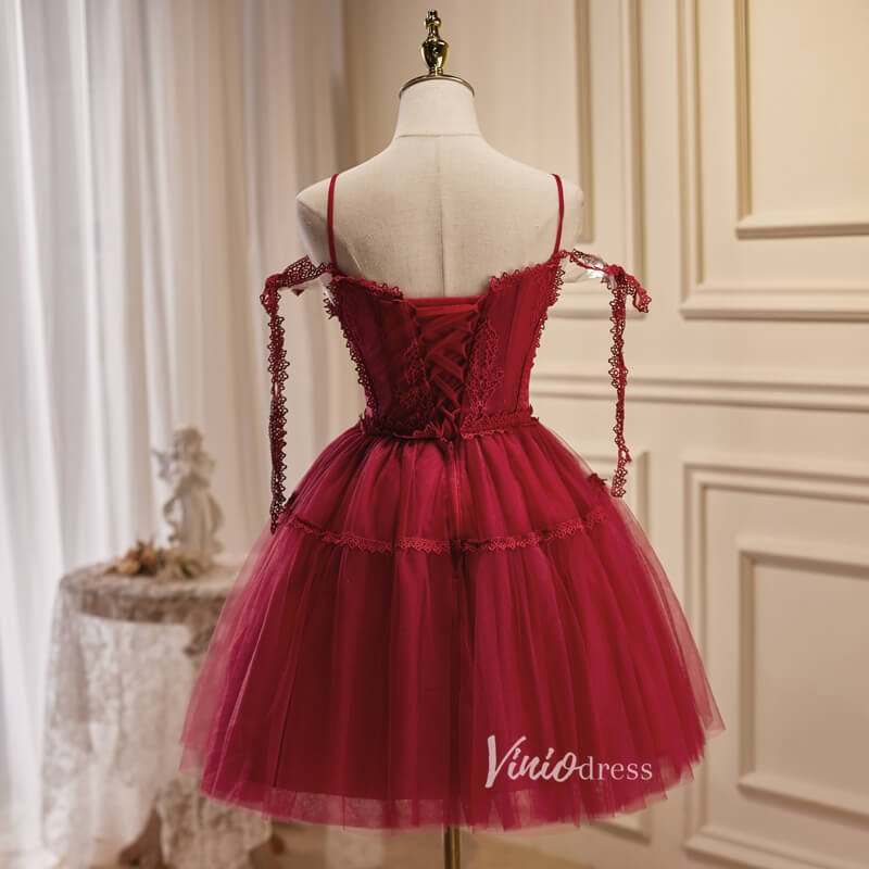 Burgundy Tulle Homecoming Dresses Spaghetti Strap Short Prom Dress SD1585