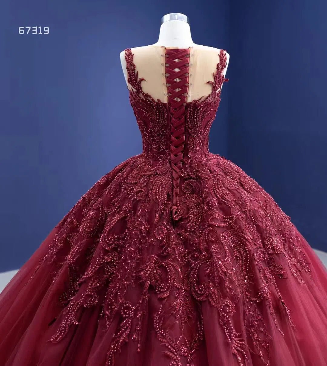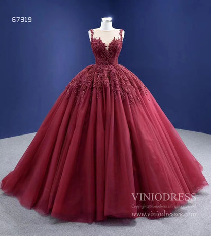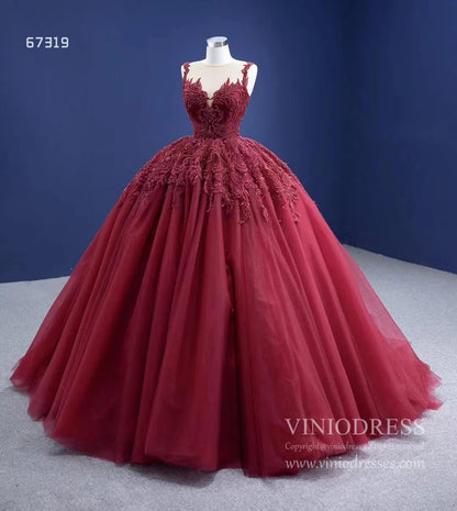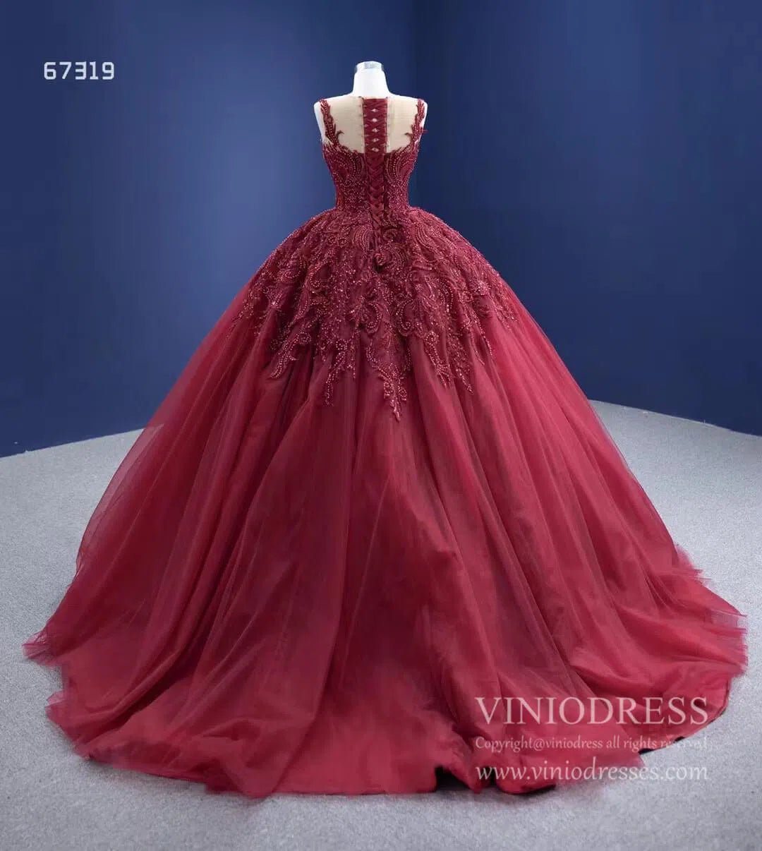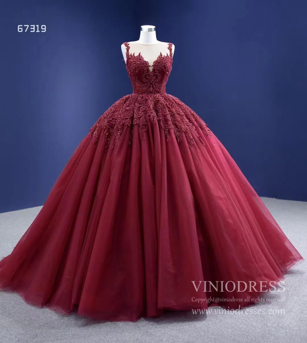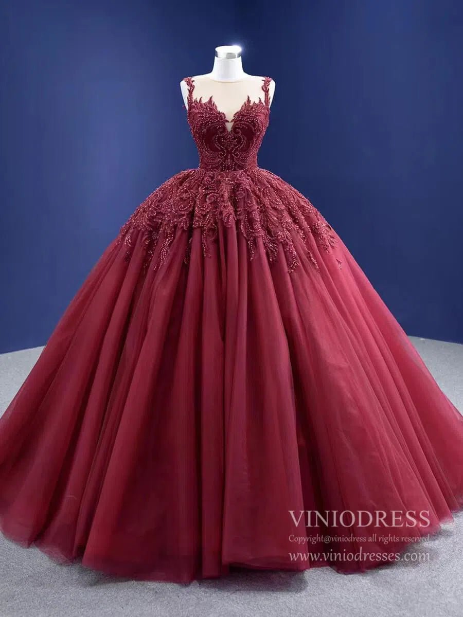 Burgundy Tulle Princess Gown Beaded Lace Quince Dresses Viniodress viniodress