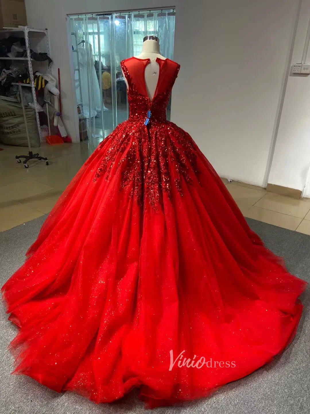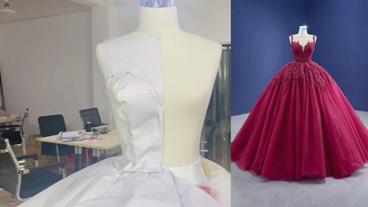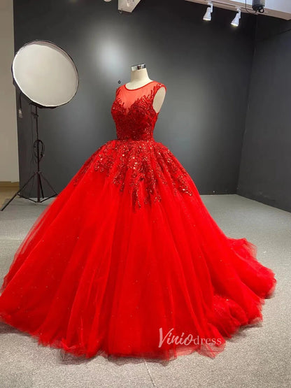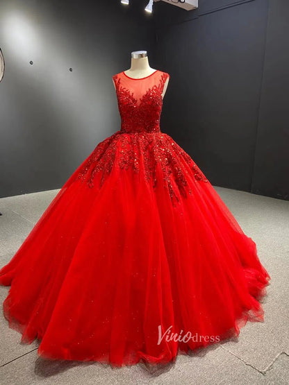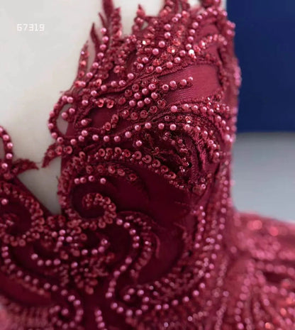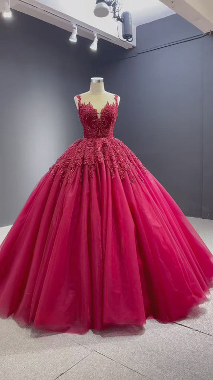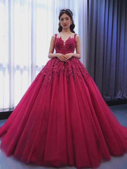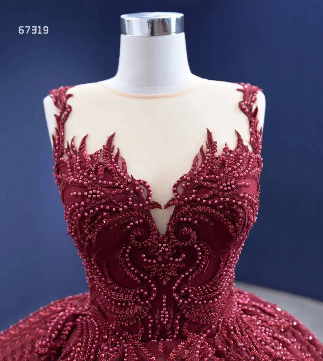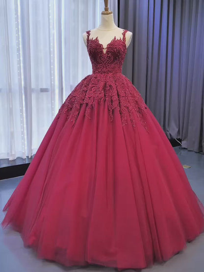 Burgundy Tulle Princess Gown Beaded Lace Quince Dresses Viniodress viniodress