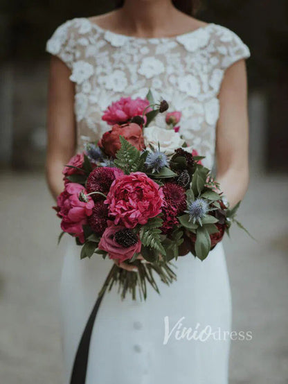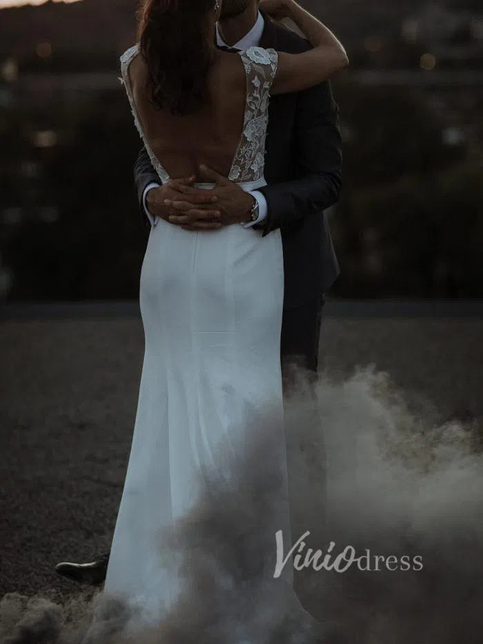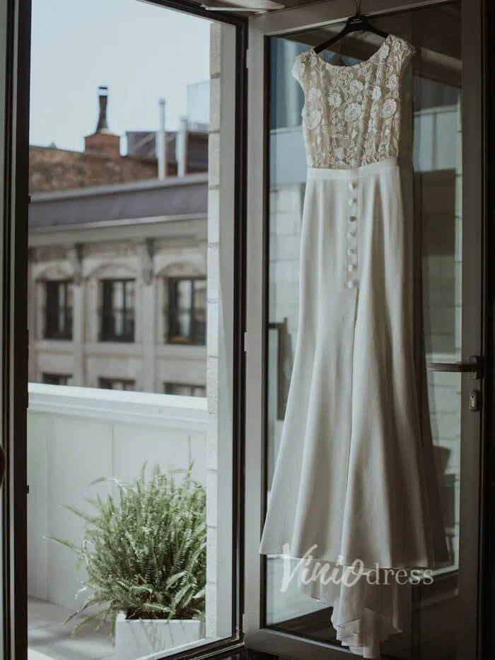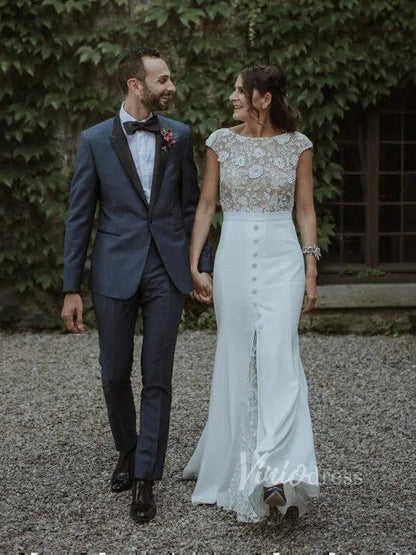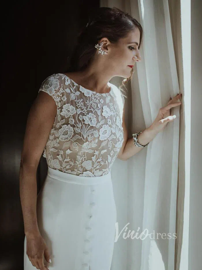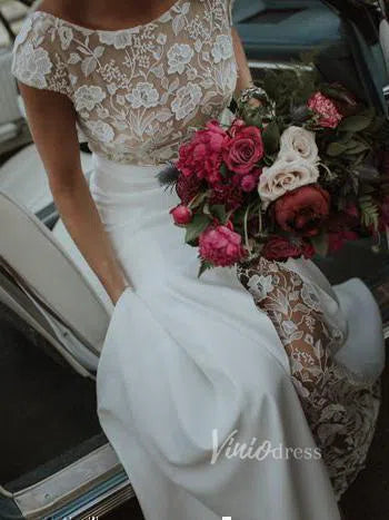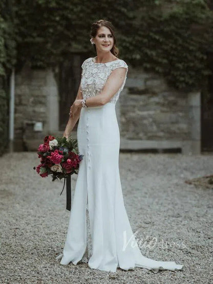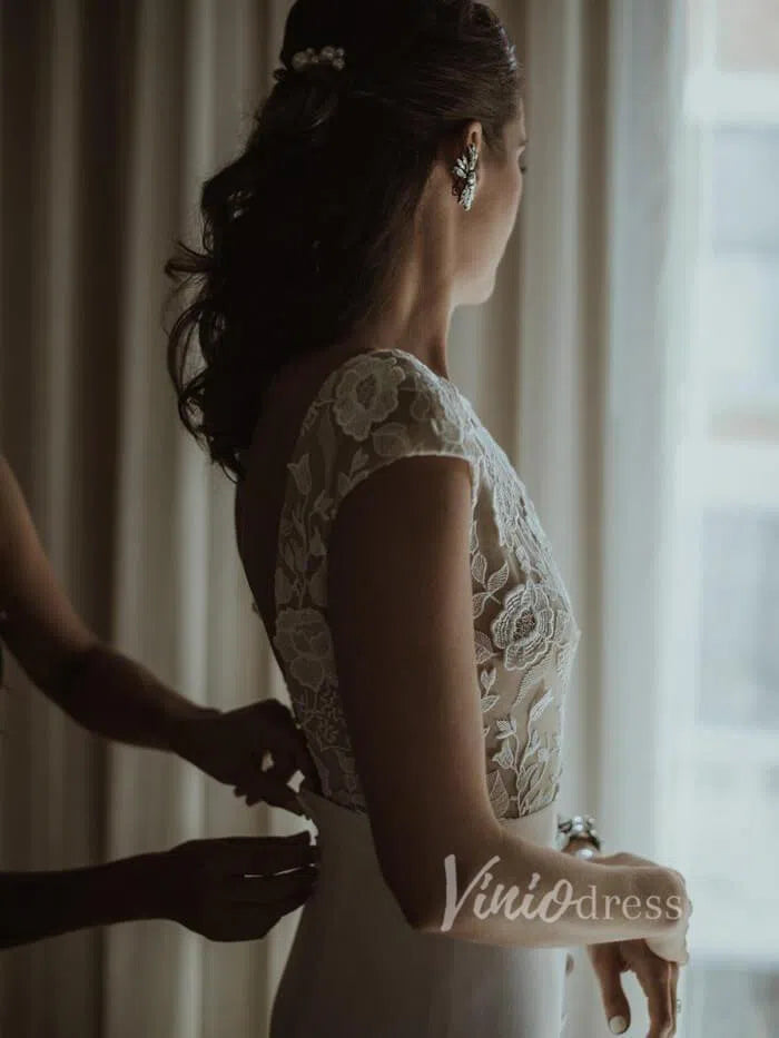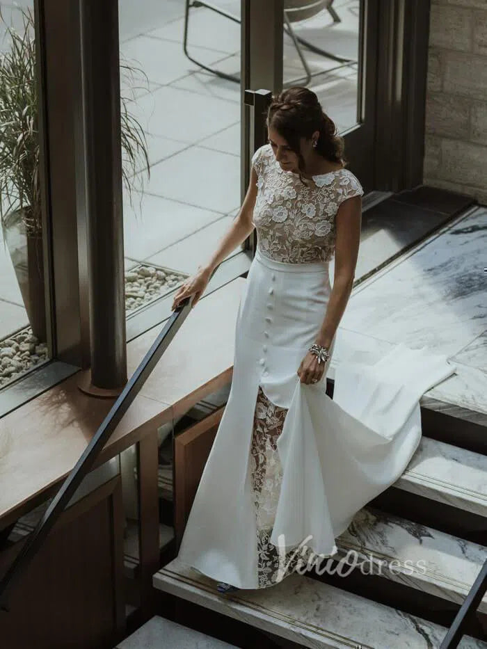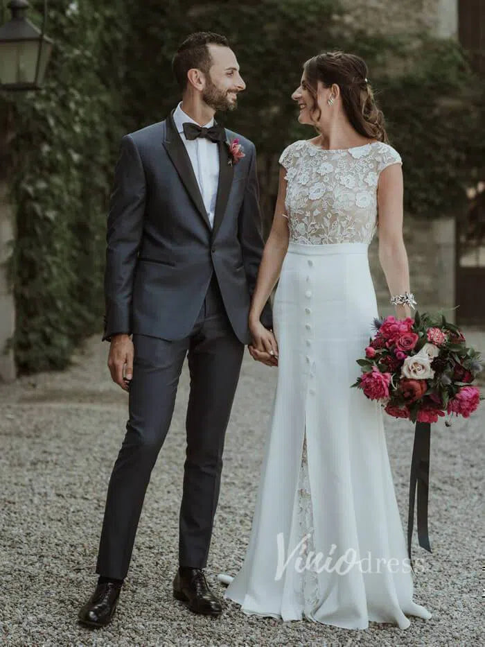 Boat neck sheath wedding dress in satin skirt featuring floral guipure lace underlay and bodice. Cap sleeve and covered buttons above slit for modest bridal look. Nude lined lace bodice gives semi-see-through effect.