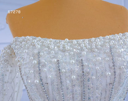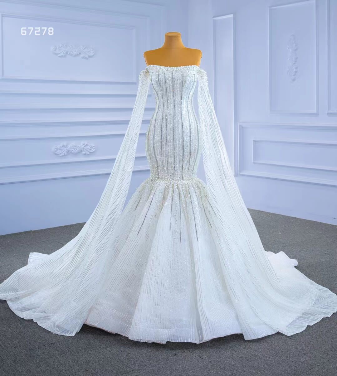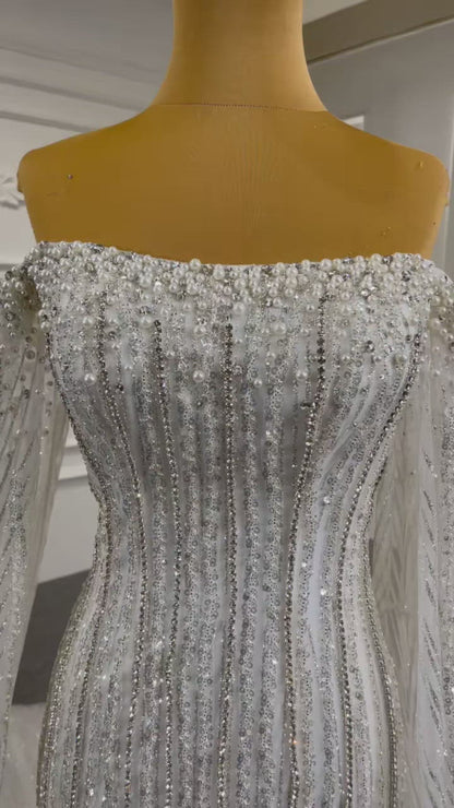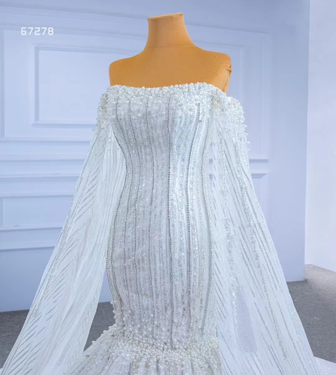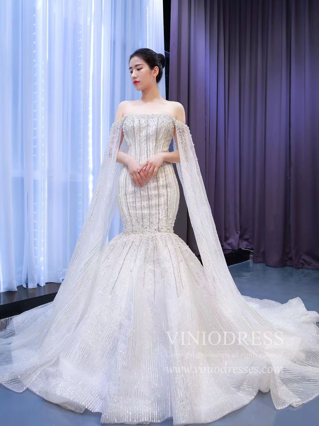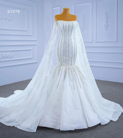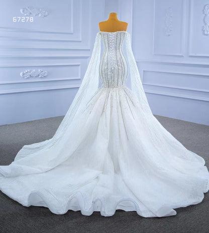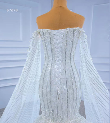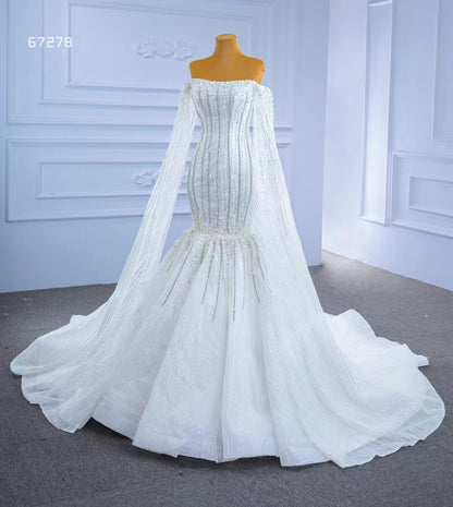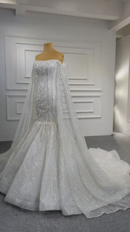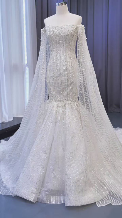 Cape Sleeve Beaded Wedding Dresses Off the Shoulder Mermaid Dress 67278 viniodress