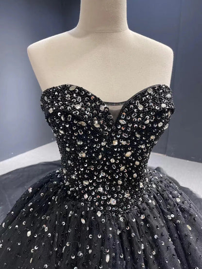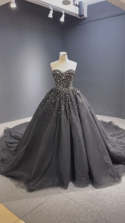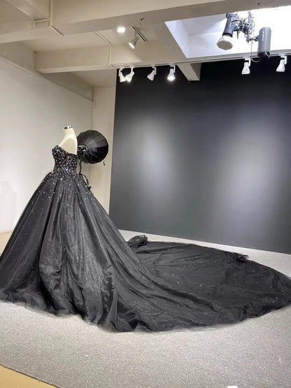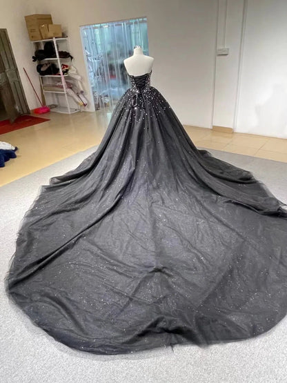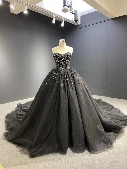 Discover the timeless sophistication of our Cathedral Train Black Ball Gown Strapless Beaded Wedding Dresses 66818 viniodress. Crafted with 2 meters of elegant train and adorned with sparkling rhinestones, this strapless black ball gown creates a stunning silhouette that will make you stand out. Available in a variety of colors.