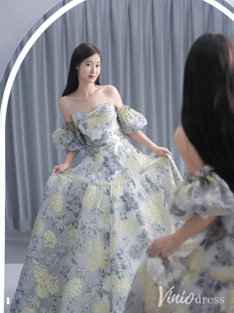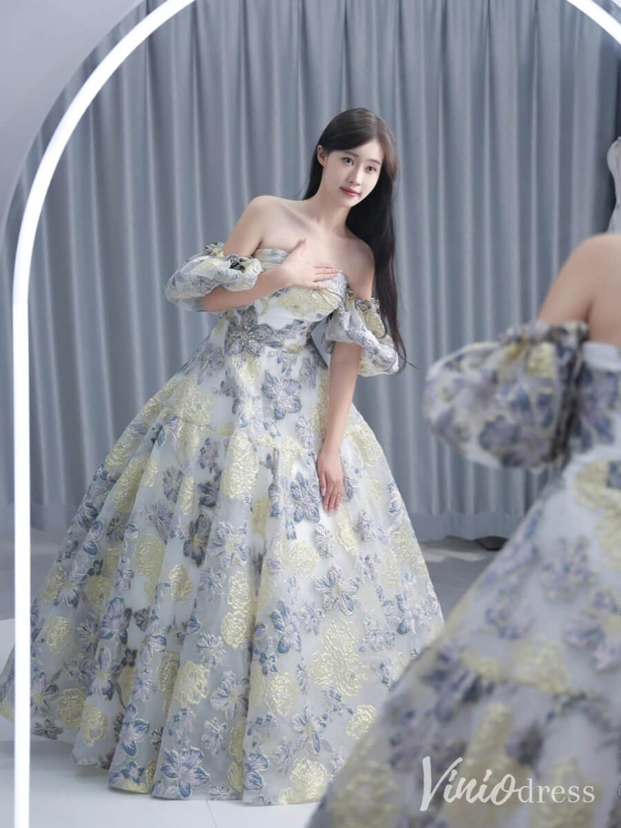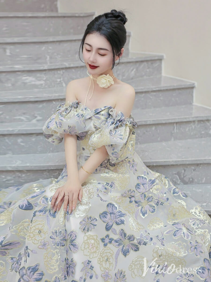 Elevate your quinceanera style with our Champagne Floral Print Prom Dresses! Designed with an elegant off the shoulder neckline and puffed sleeves, this dress features a beautiful floral print on a champagne colored fabric. Let your natural beauty shine through with this sophisticated and feminine dress.