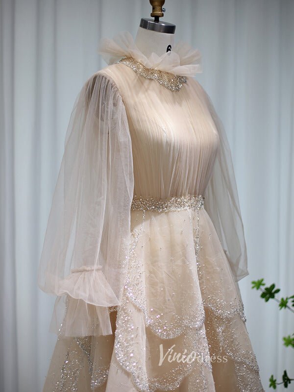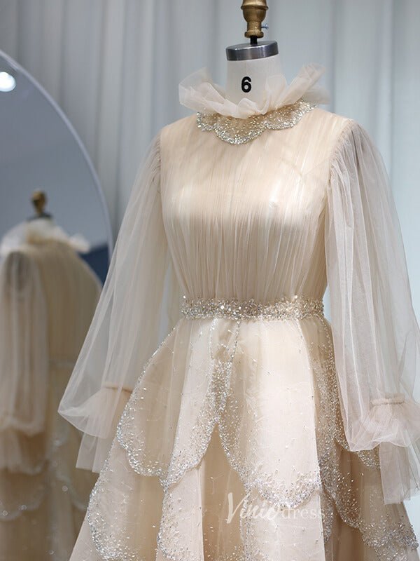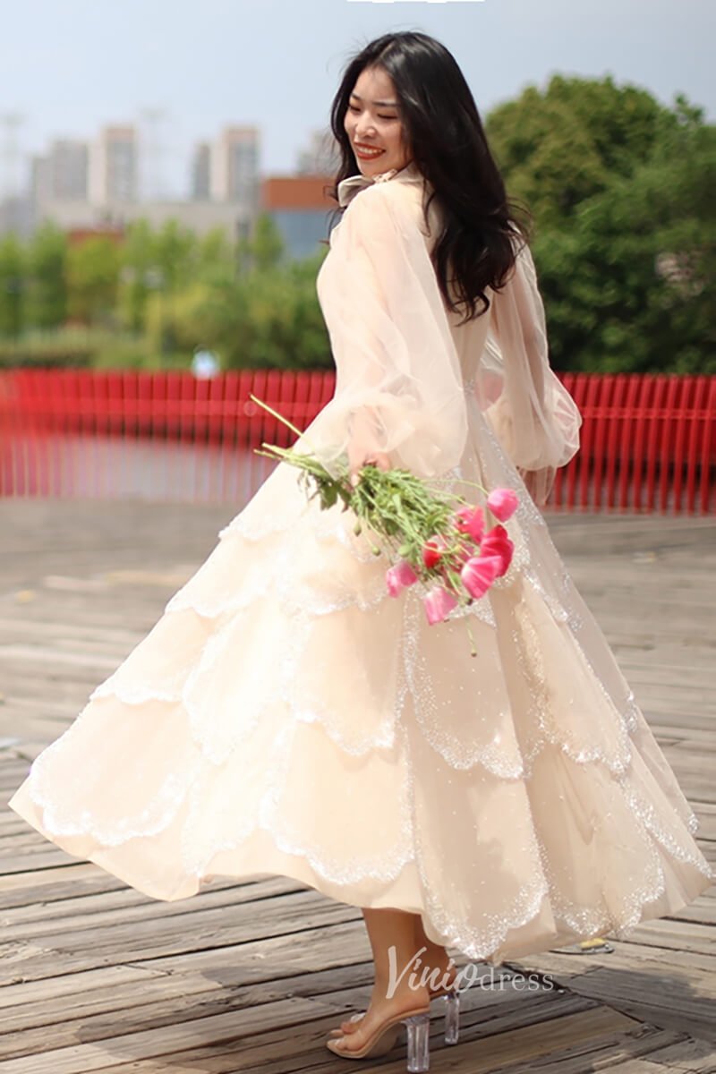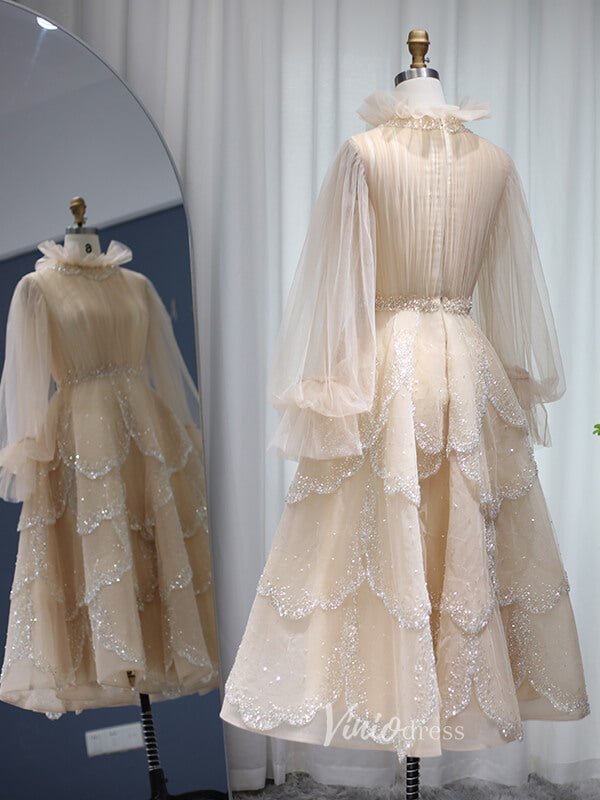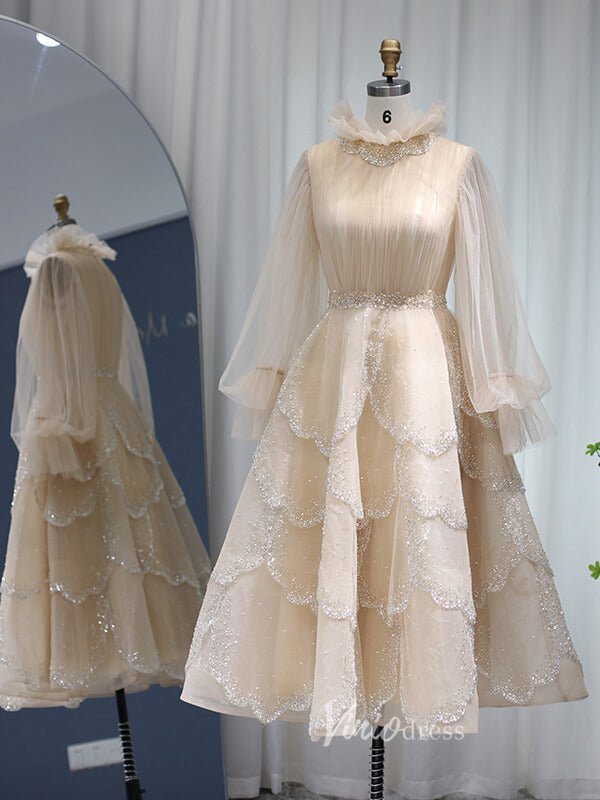 Champagne Ruffle Prom Dresses Long Sleeve Tea Length Evening Gown 20100