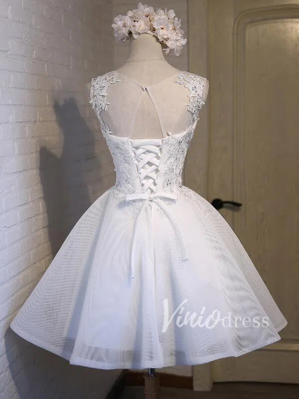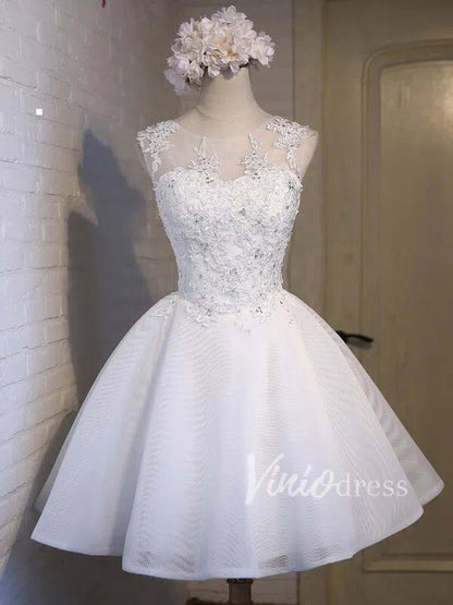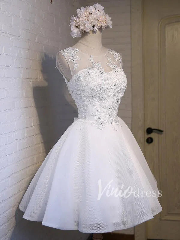 • Simple homecoming dress with lace appliquéd bodice and illusion neckline.