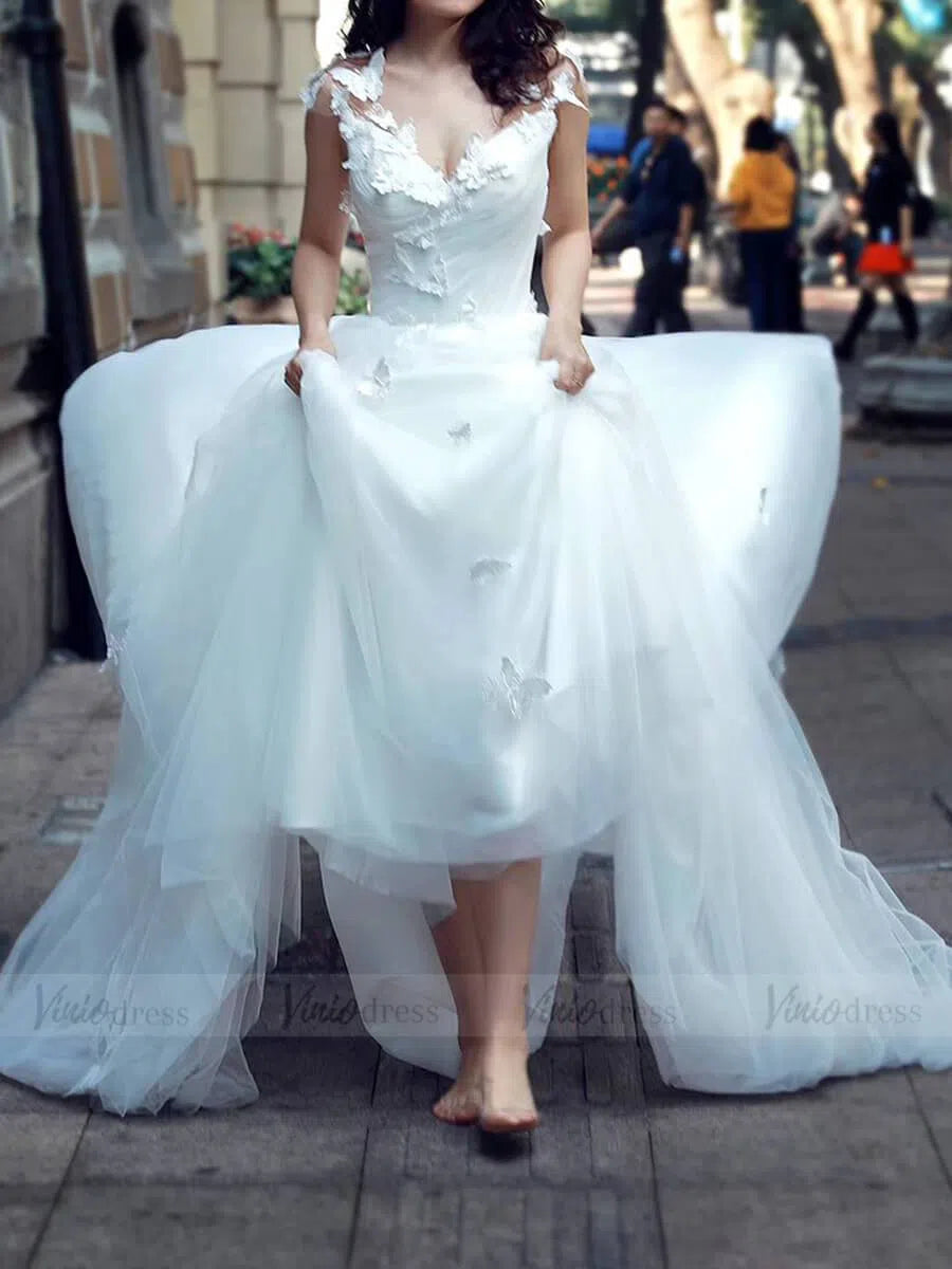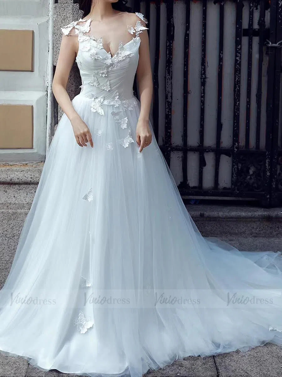 - Tulle Ball Gown Silhouette - Sheer Corset Bodice with Draped Tulle - Romantic Off-Shoulder Draped Sleeves - Structured Waist for Flattering Shape - Lightweight Layered Tulle Skirt - Buttons Down the Back - Soft Chapel Train - Optional Removable Sleeves ($50)