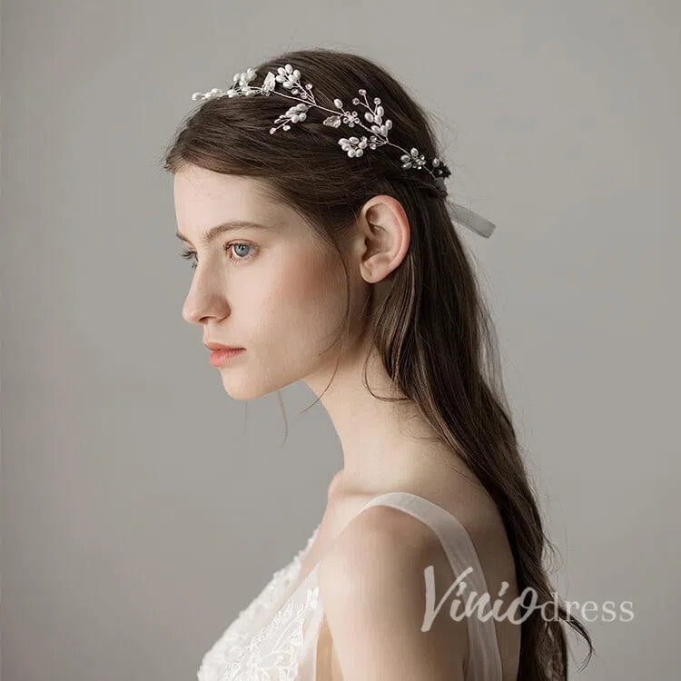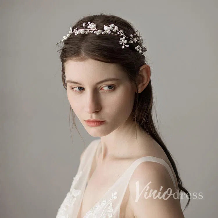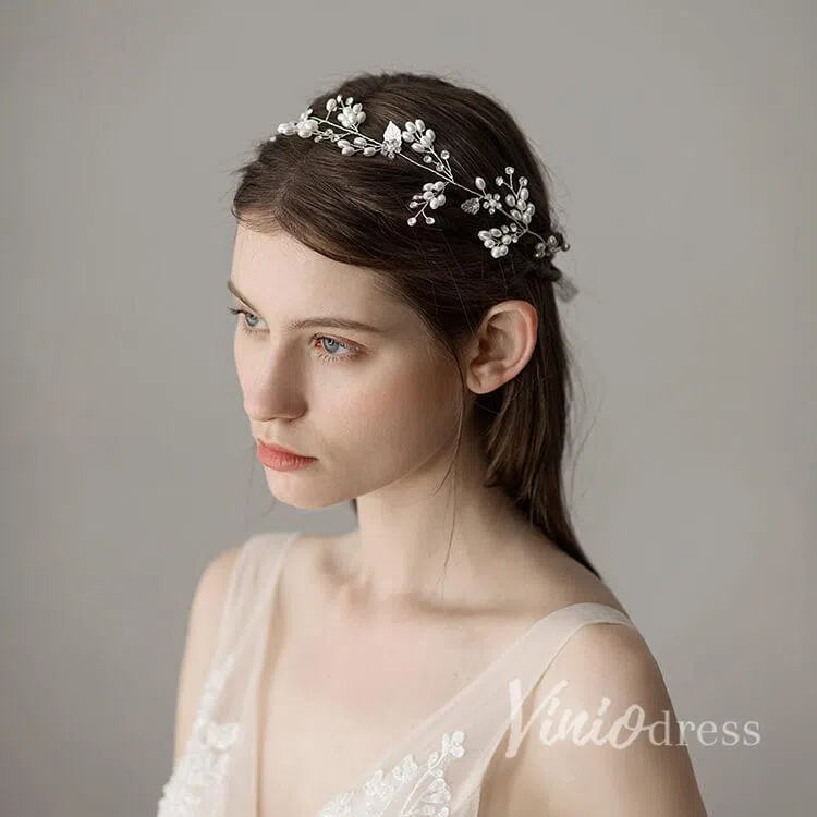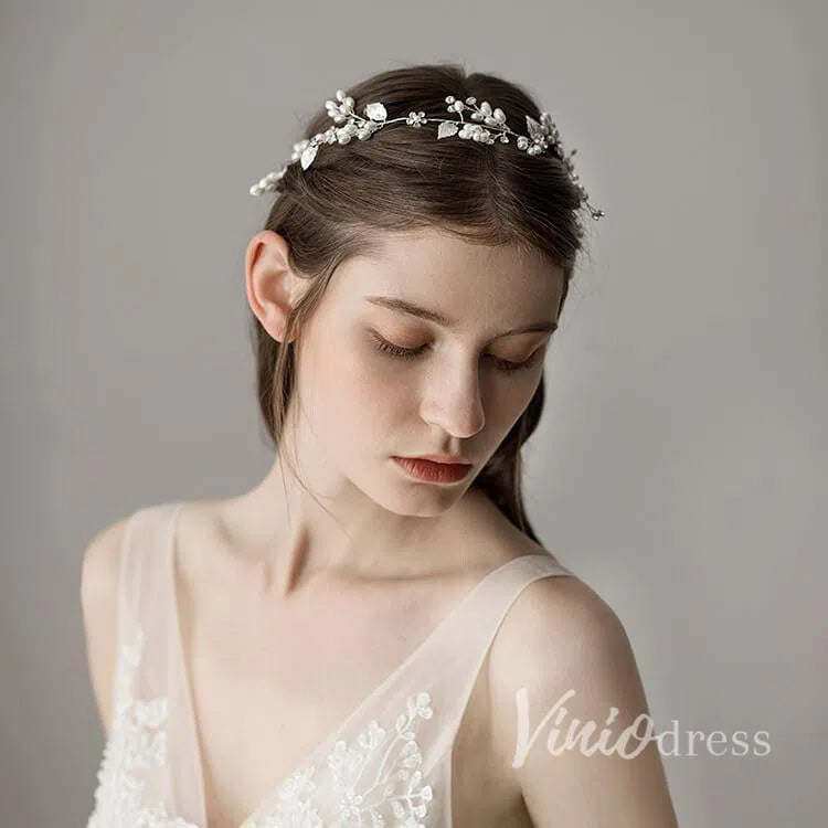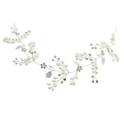 Crystal and Pearl Sprig Silver Bridal Headbands with Leaves ACC1118