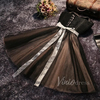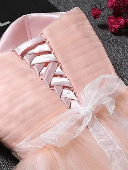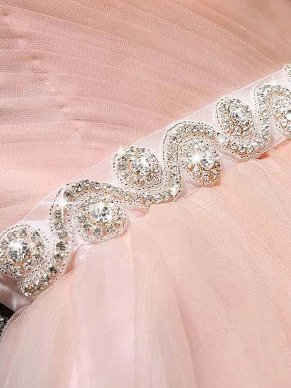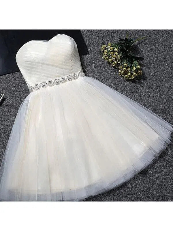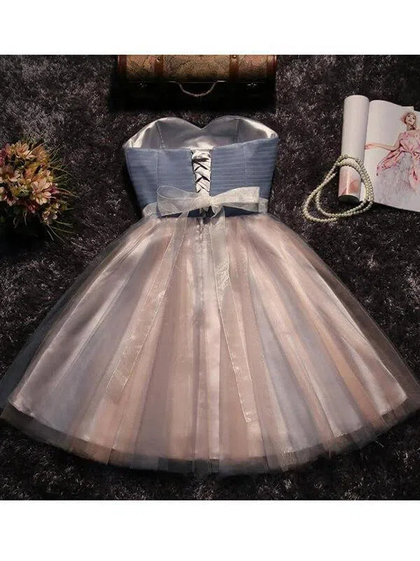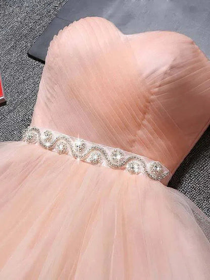 Classic strapless homecoming dress features cute sweetheart neckline and beaded ribbon sash. Finished with corset back closure.