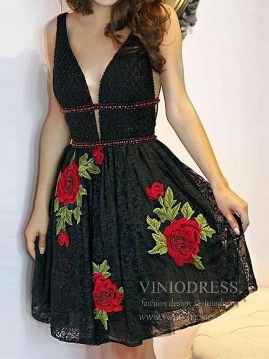 Deep V Neck Beaded Black Lace Homecoming Dresses SD1254