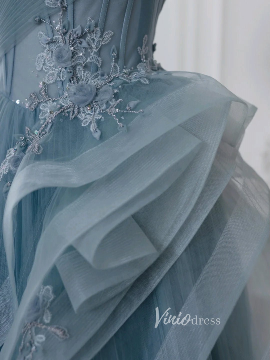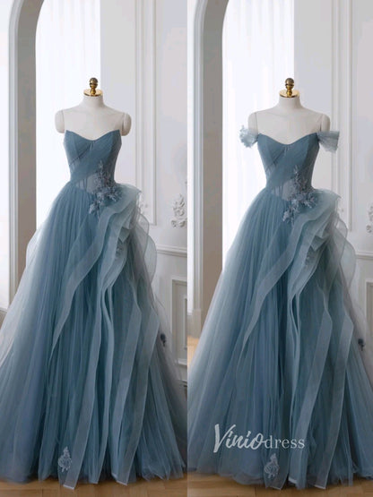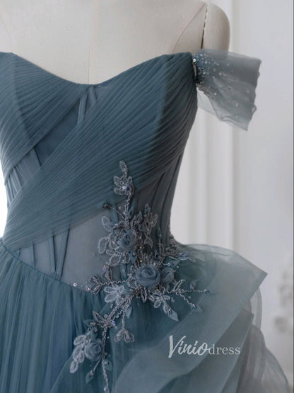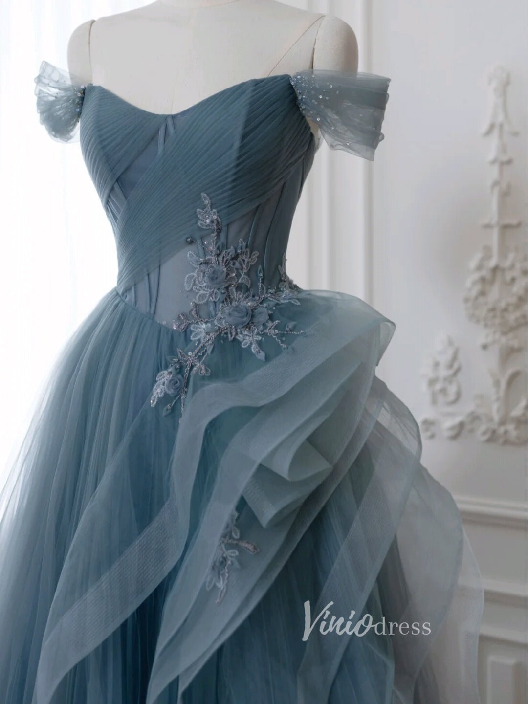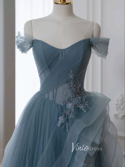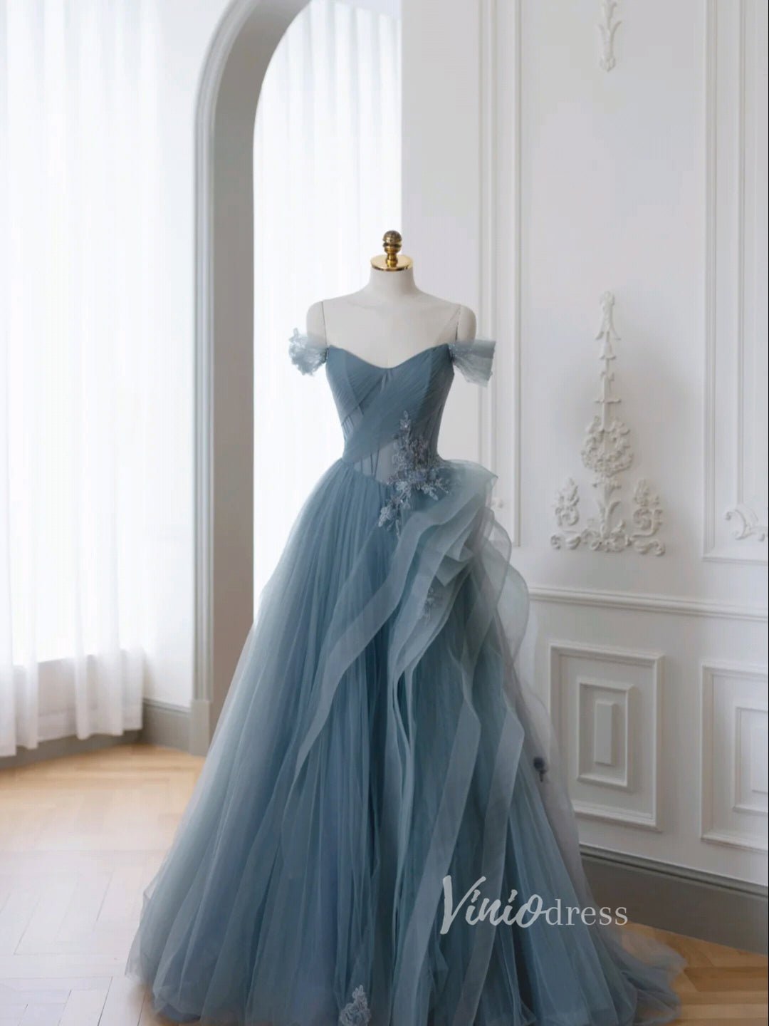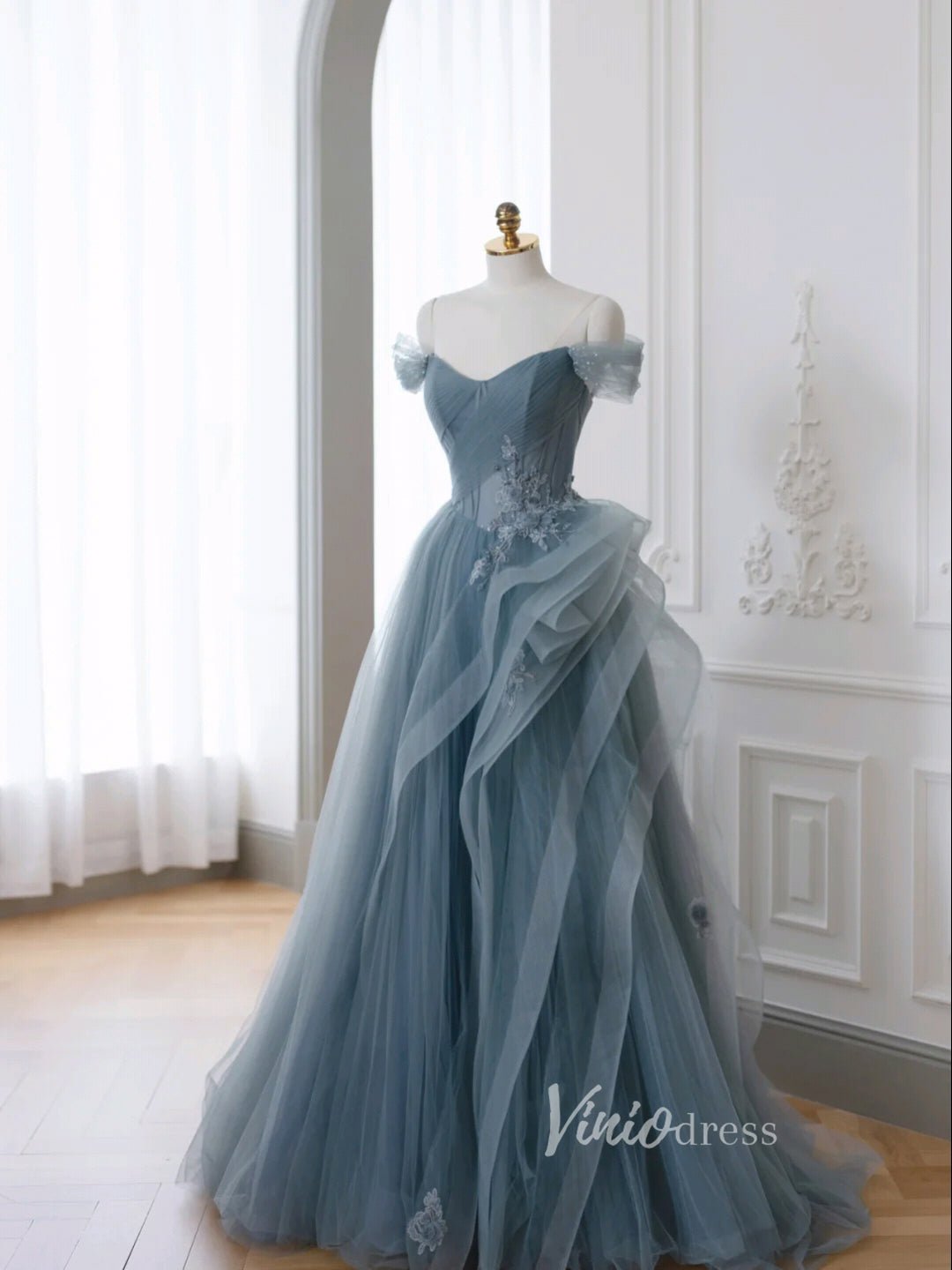 Dusty Blue Tulle Prom Dresses Off the Shoulder Removable Sleeve Evening Dress FD3216