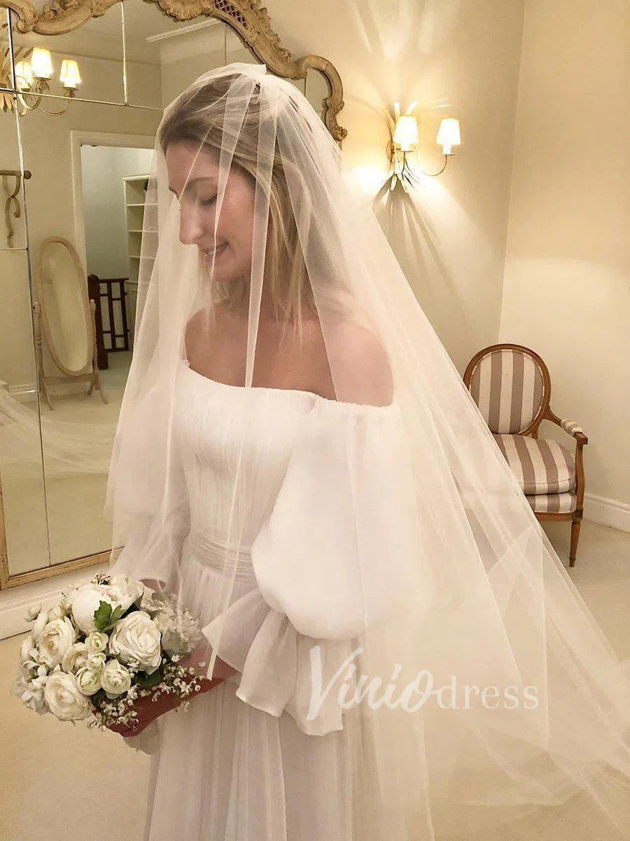 • Off the shoulder chiffon bridal dress with puffy sleeves.