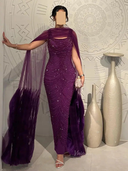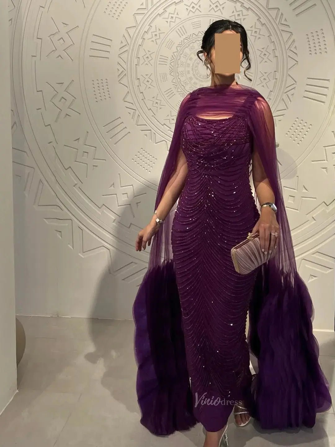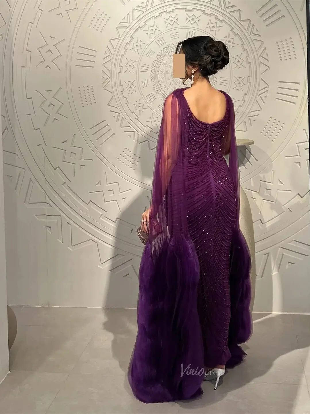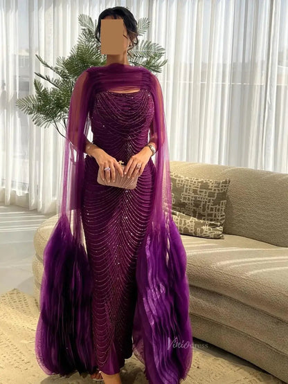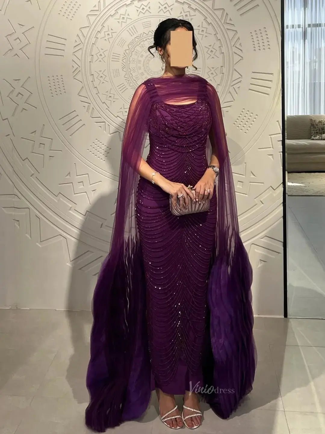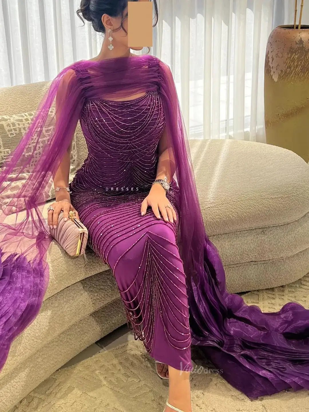 Elegant Purple Prom Dresses Cape Sleeve Beaded Formal Dresses BD017