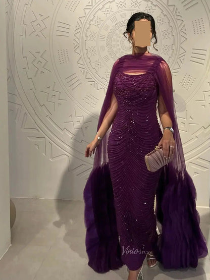 This elegant purple prom dress is a luxury 2-in-1 formal dress that features a beaded sheath dress and beautiful ruffled cape sleeves. Perfect for any formal event.