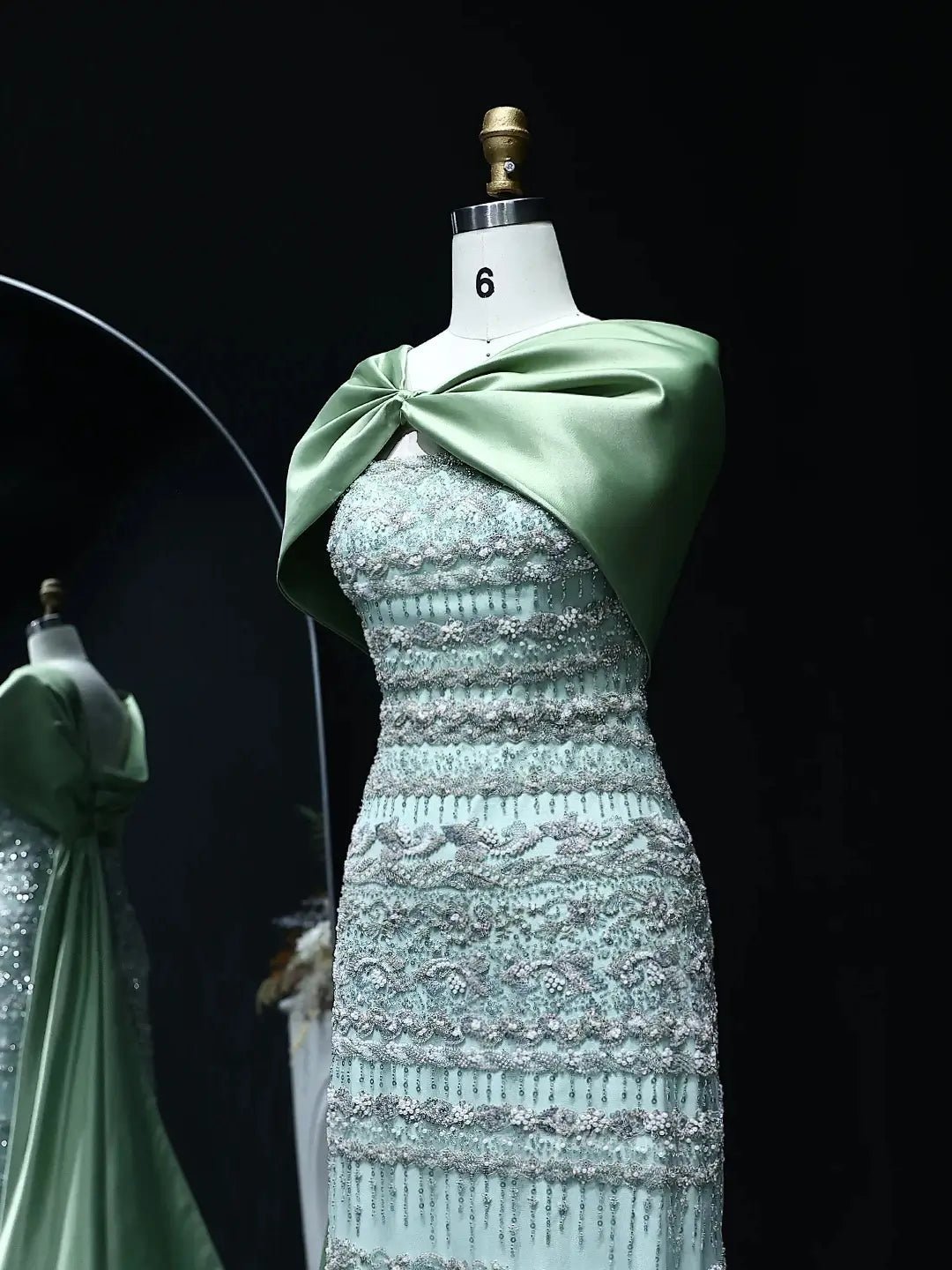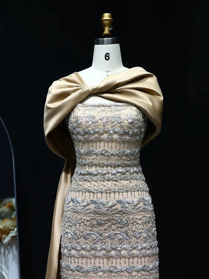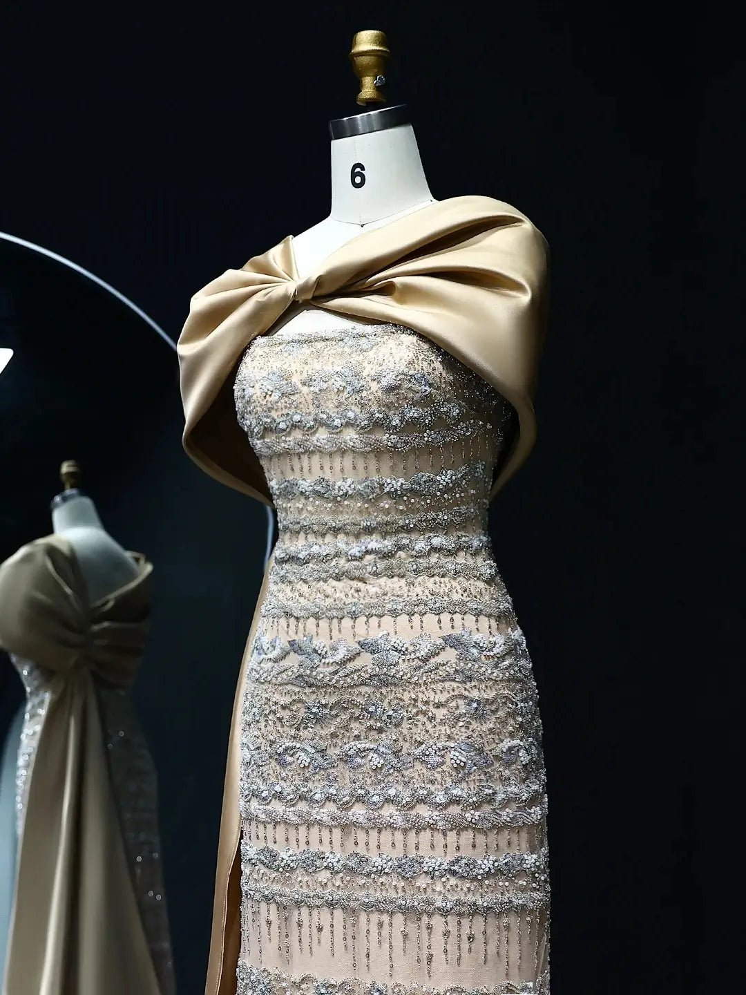 This 2-in-1 prom dress exudes elegance and luxury, perfect for weddings and formal events. The beaded design and satin back draped train add a touch of sophistication. Make a statement with this exquisite sheath dress.
