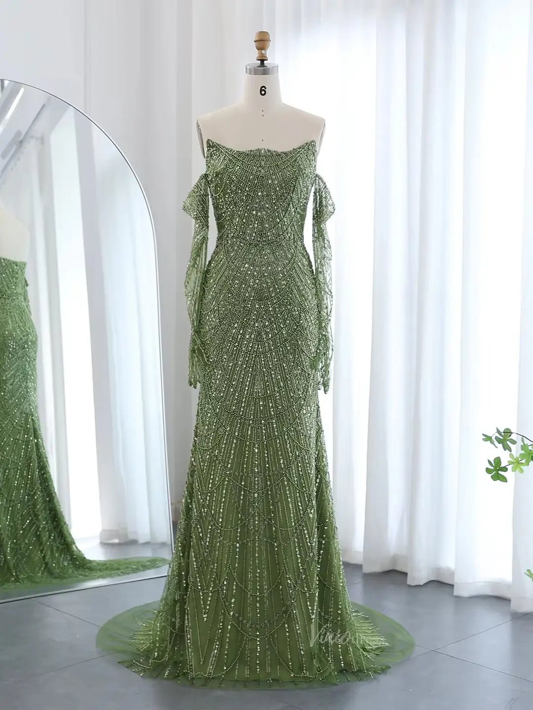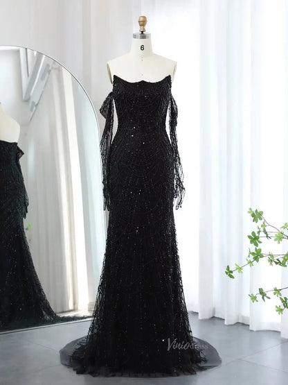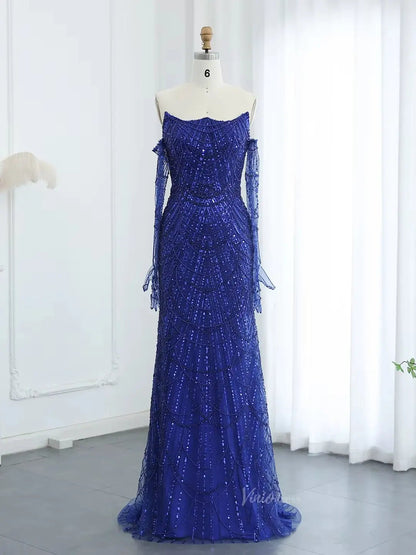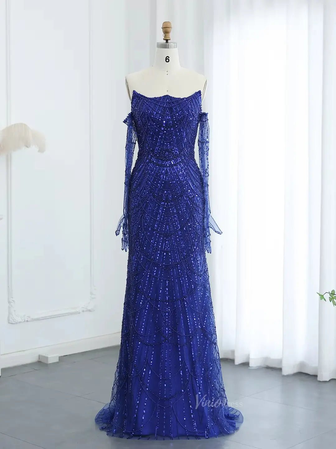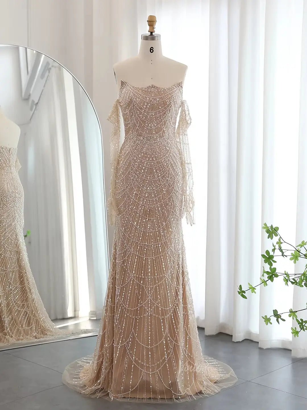 Elegant Sparkle Prom Dresses Luxury Beaded Formal Dresses with Long Sleeves BD045