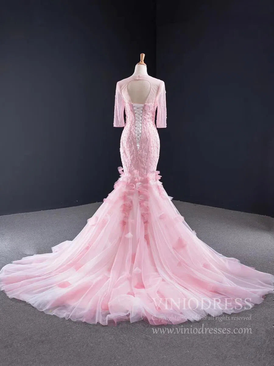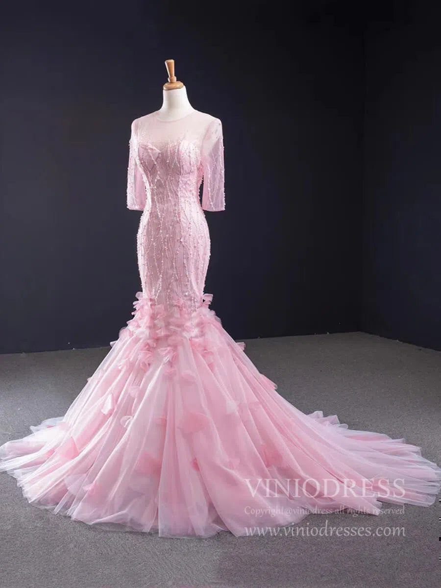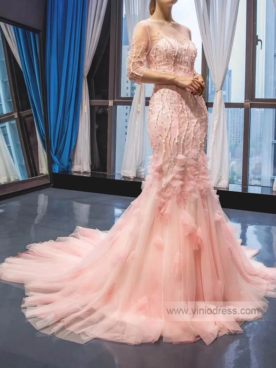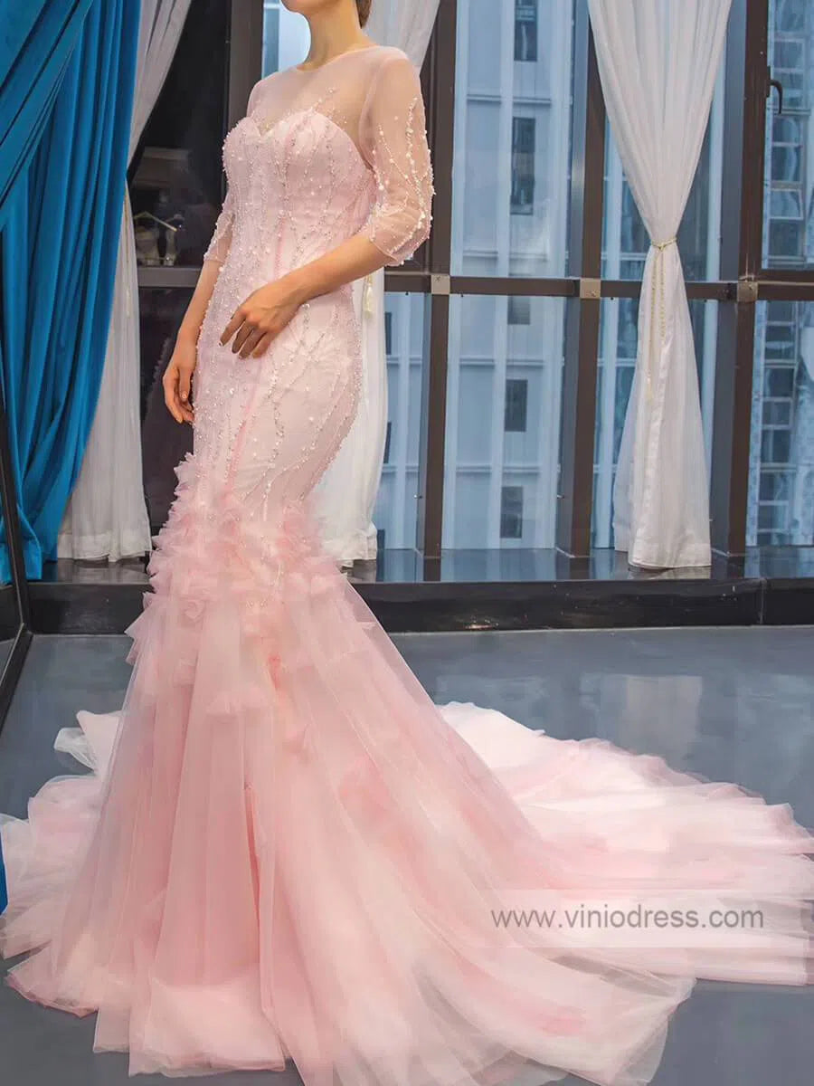 This haute couture beaded pink mermaid wedding dress features an elegant illusion neckline and a supportive corset back. The fitted mermaid silhouette includes a side slit and a dramatic ruffled tail with a 1-meter length for added movement. The gown is detailed with a beaded bodice and a sculptural ruffle flower shoulder detail on the right side. Designed with layered fabrics for structure and texture, this style is suitable for weddings, formal events, and other occasions where a pink mermaid wedding gown is desired.