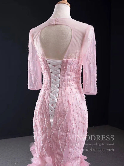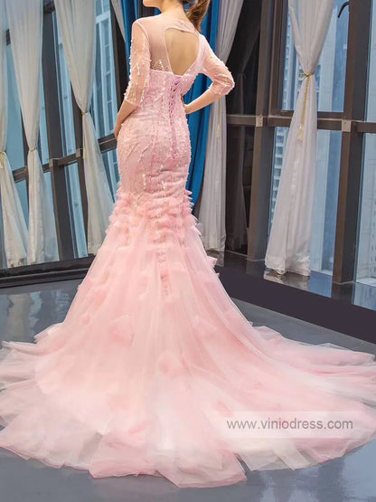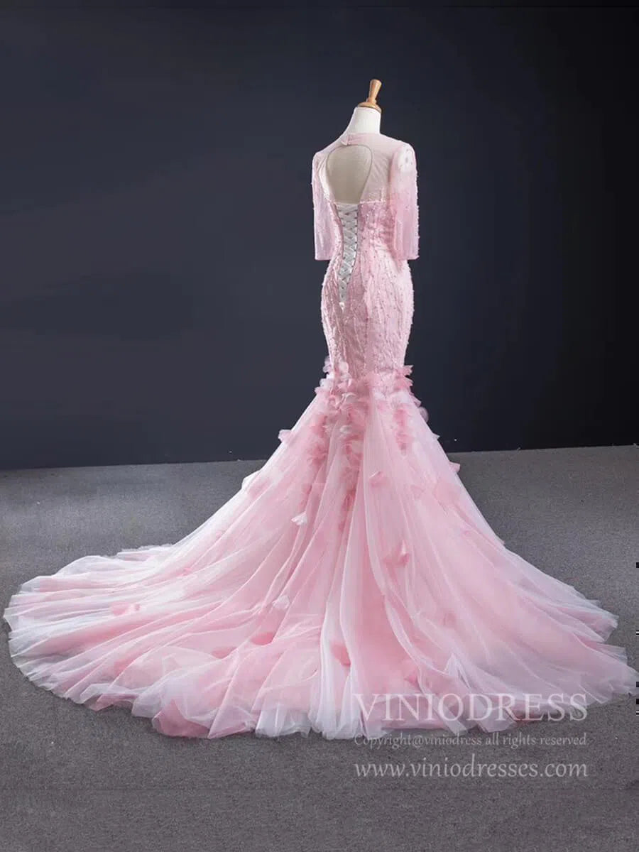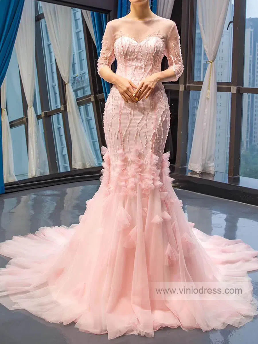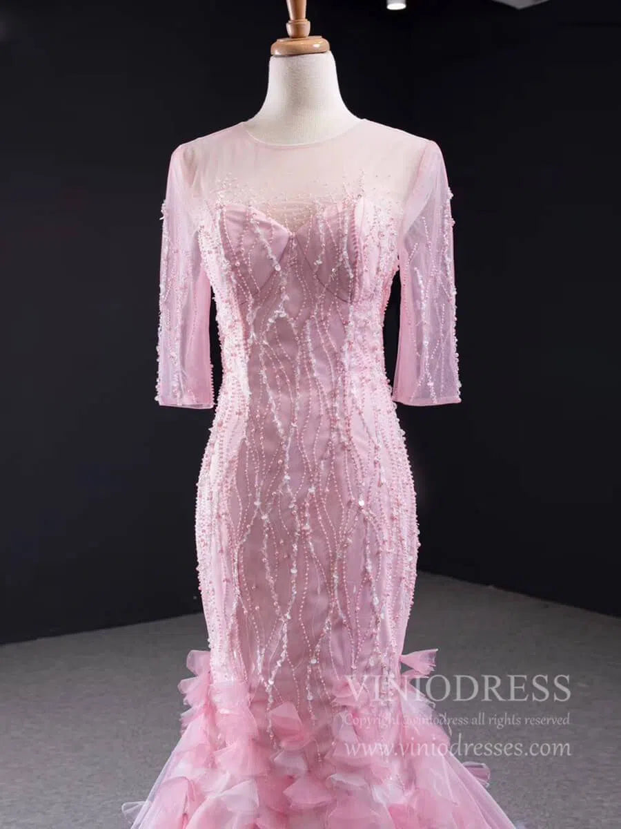 This haute couture beaded pink mermaid wedding dress features an elegant illusion neckline and a supportive corset back. The fitted mermaid silhouette includes a side slit and a dramatic ruffled tail with a 1-meter length for added movement. The gown is detailed with a beaded bodice and a sculptural ruffle flower shoulder detail on the right side. Designed with layered fabrics for structure and texture, this style is suitable for weddings, formal events, and other occasions where a pink mermaid wedding gown is desired.