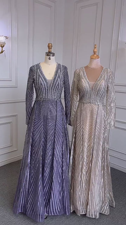 Beaded lace formal dresses with long sleeves.