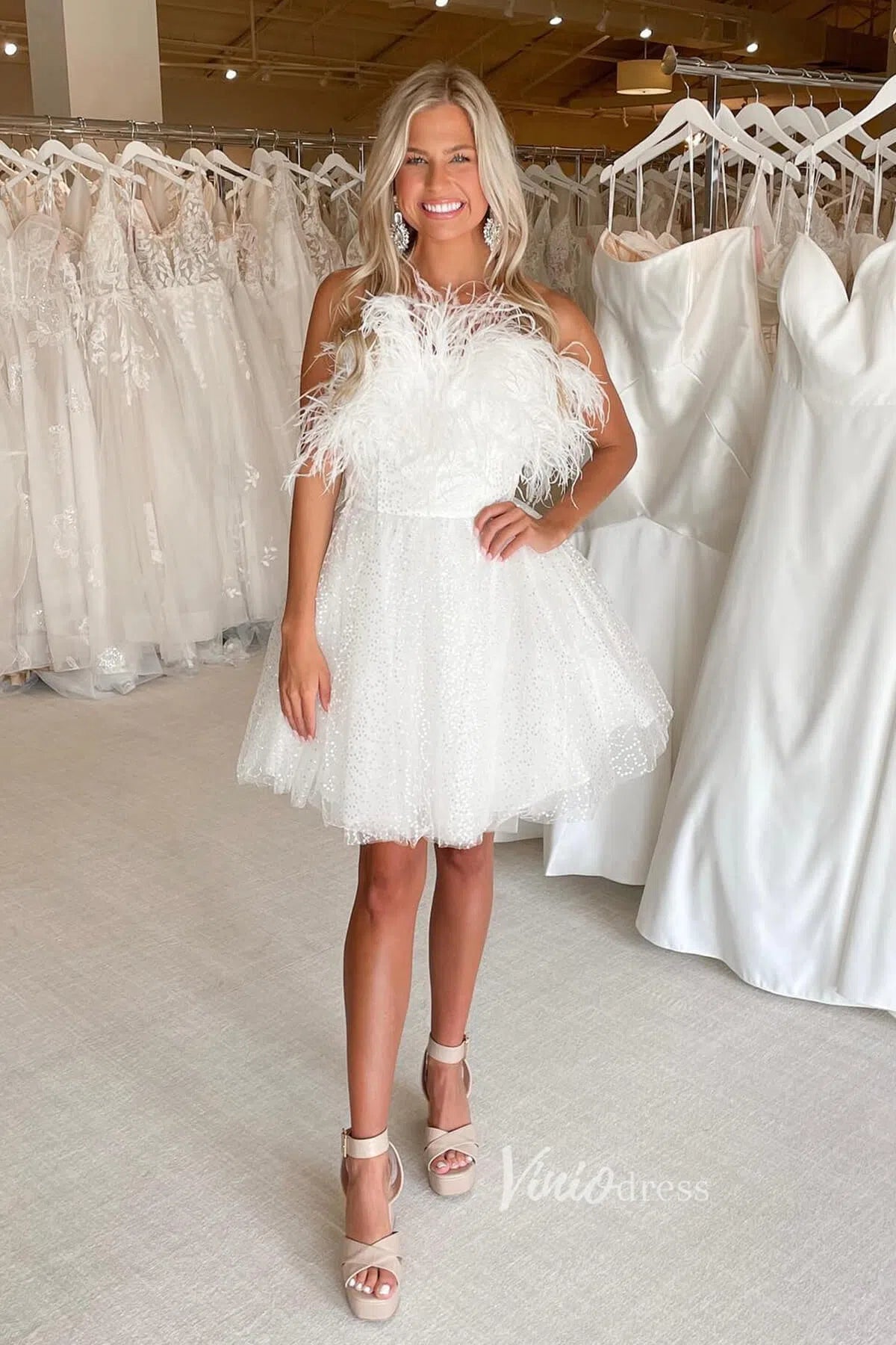 • Glitter short hoco dress with feather details.
