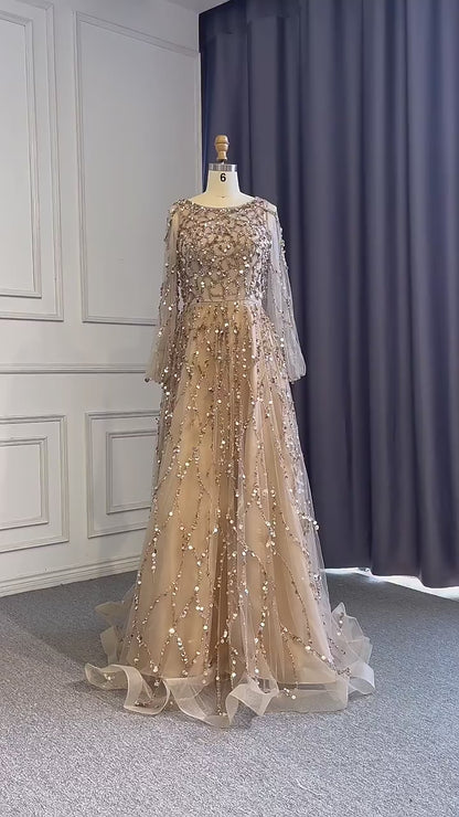 Gold Beaded Long Sleeve Evening Dresses A-Line Boat Neck Pageant Dress FD3009