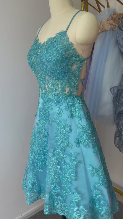 Aqua Blue Lace Homecoming Dresses Spaghetti Strap SD1129