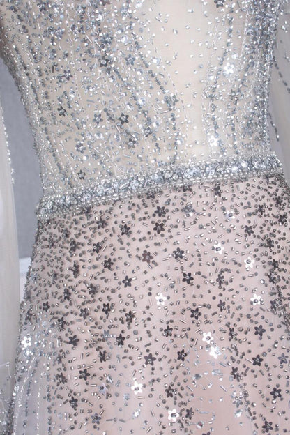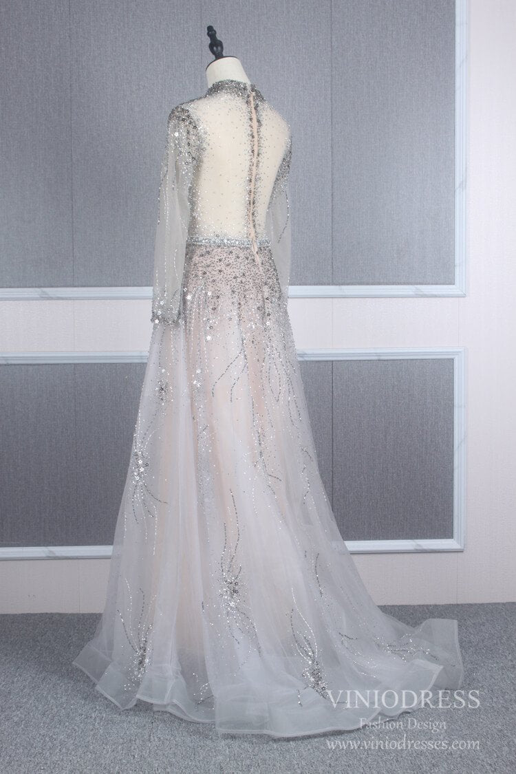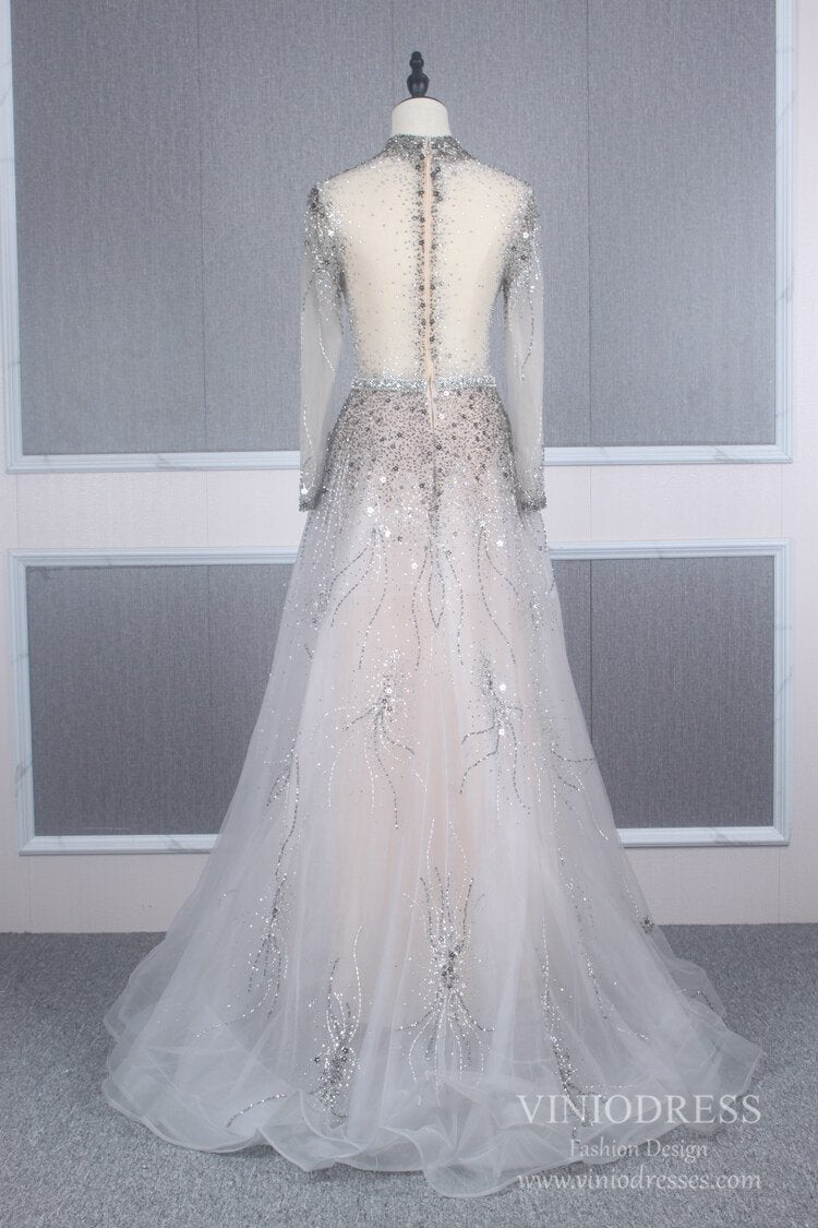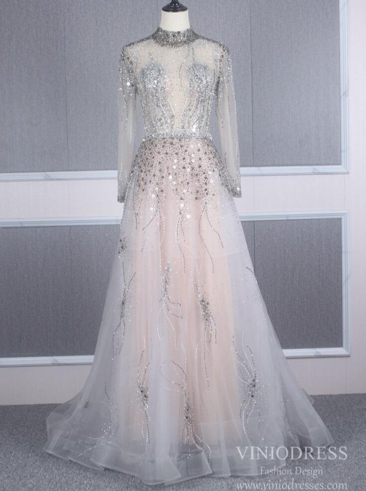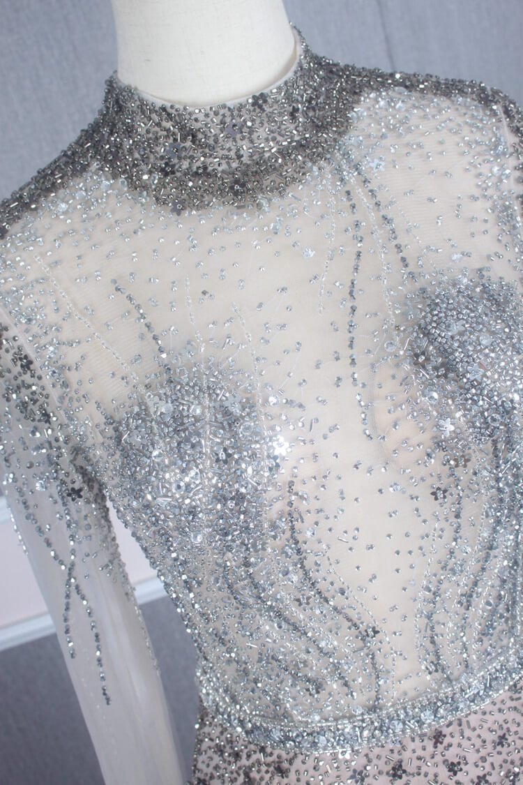 Gray Beaded High Neck Porm Dresses Long Sleeve Evening Dress FD2502