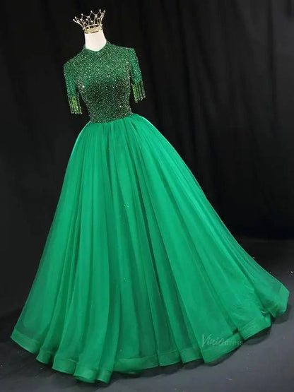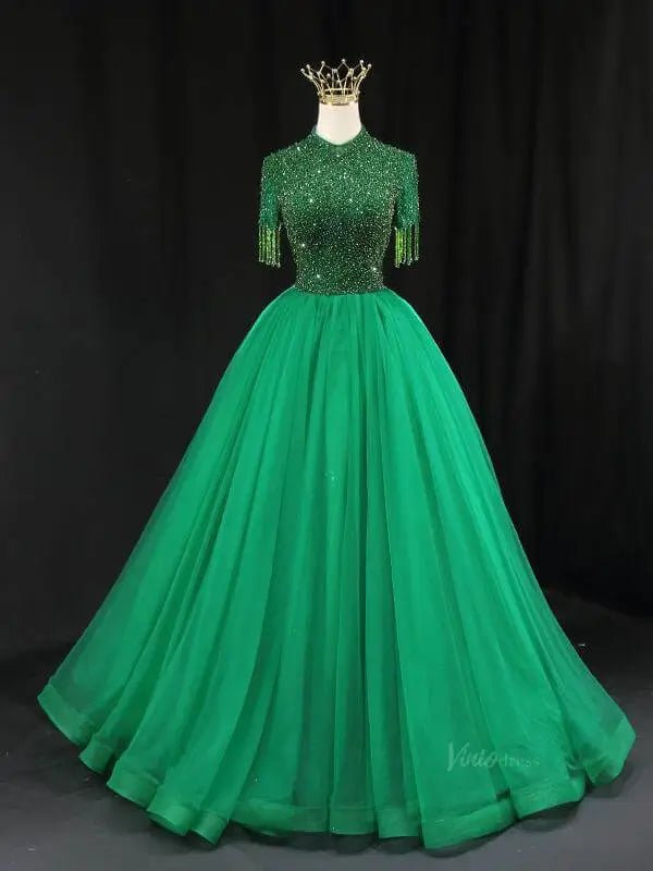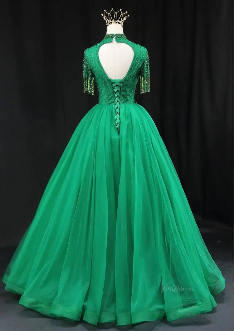 Take your style to the next level with our Green Tulle Prom Dress! With a bold high neck and intricate beaded bodice, this dress is perfect for the risk-takers. The tassels and short sleeves add flair, while the tulle bottom adds a touch of adventure to your special event. Dare to stand out in this bold Quinceanera Dress SU080!
