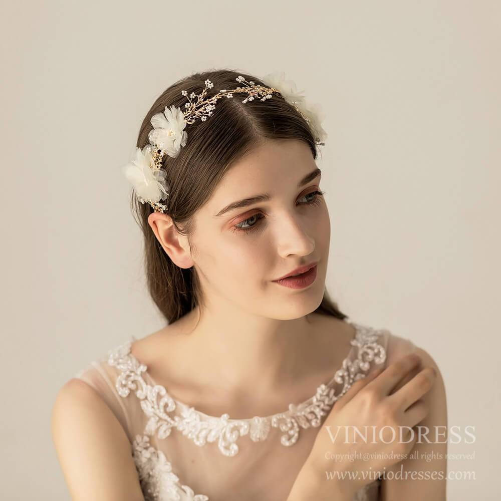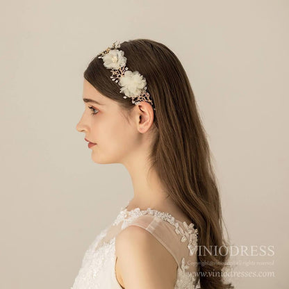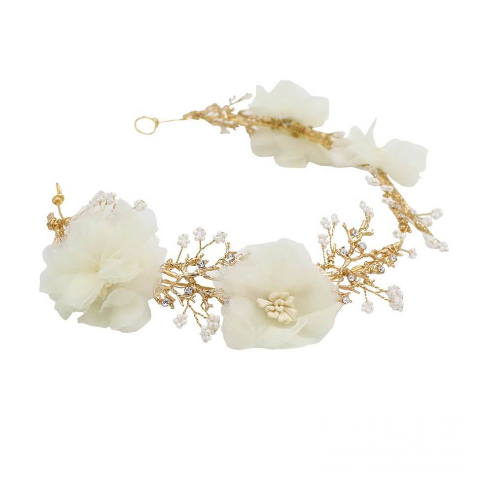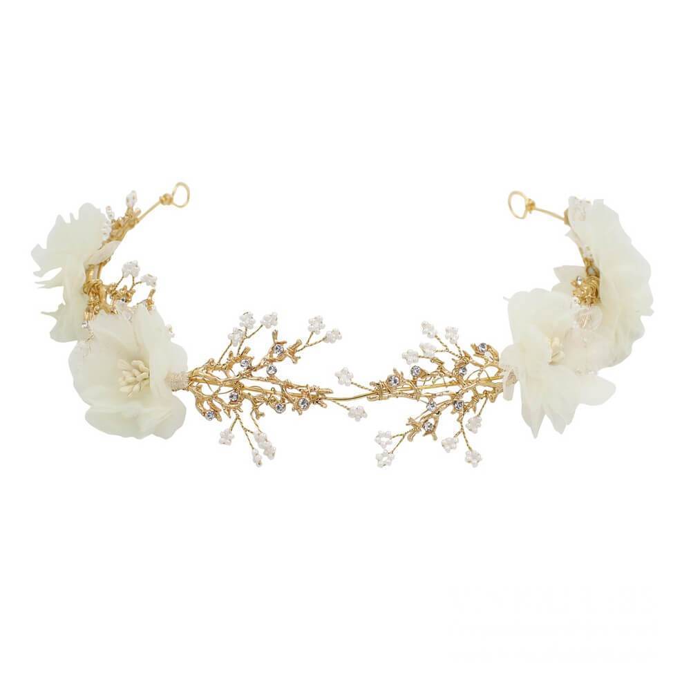 The organza floral design adorned in wired sprigs features tiny beaded flowers and petals.