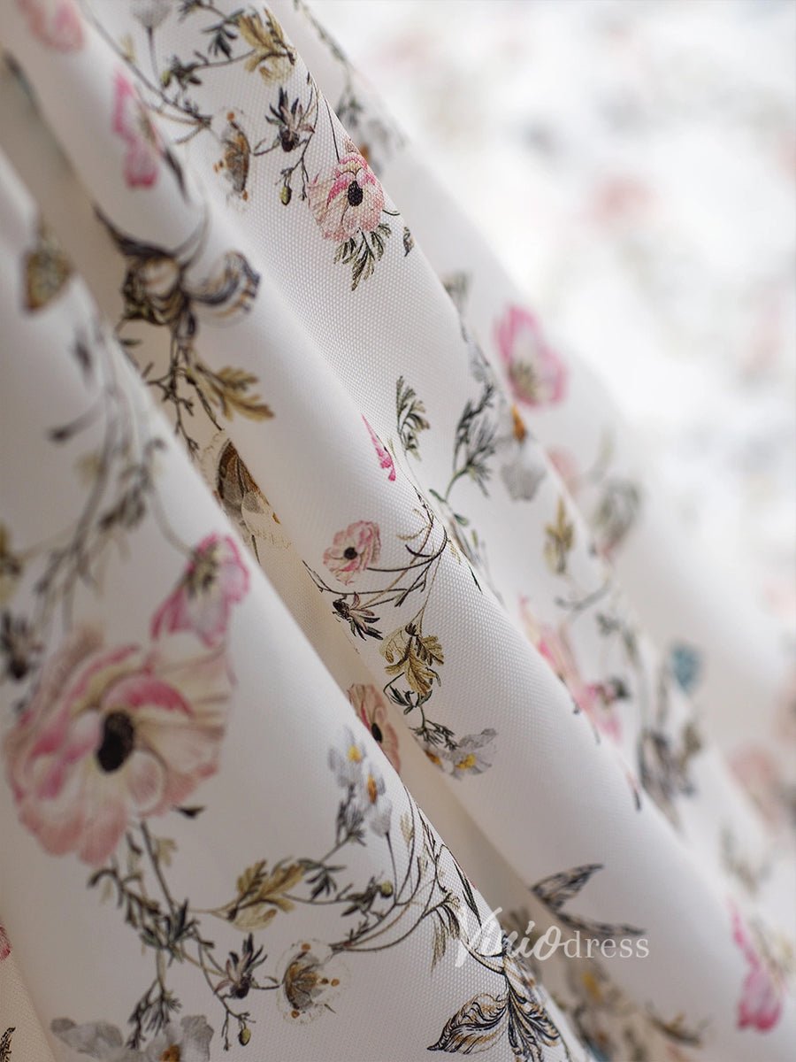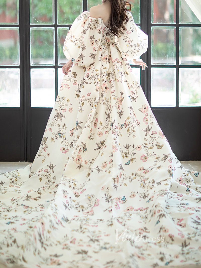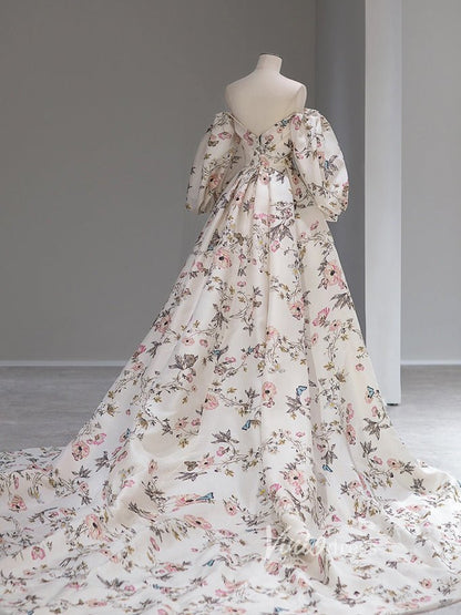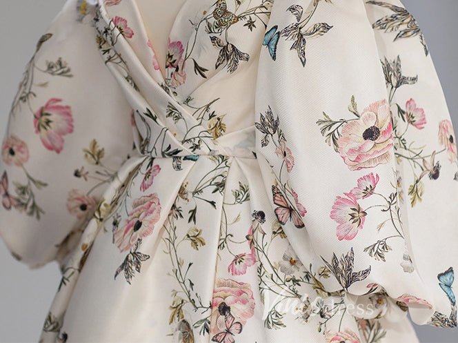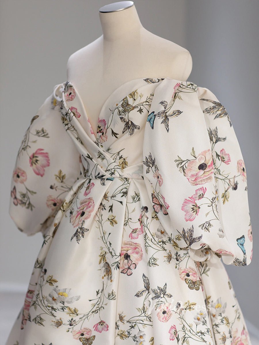 Elegant off-the-shoulder prom dress made with floral print satin, featuring side slit and puffed long sleeve.
