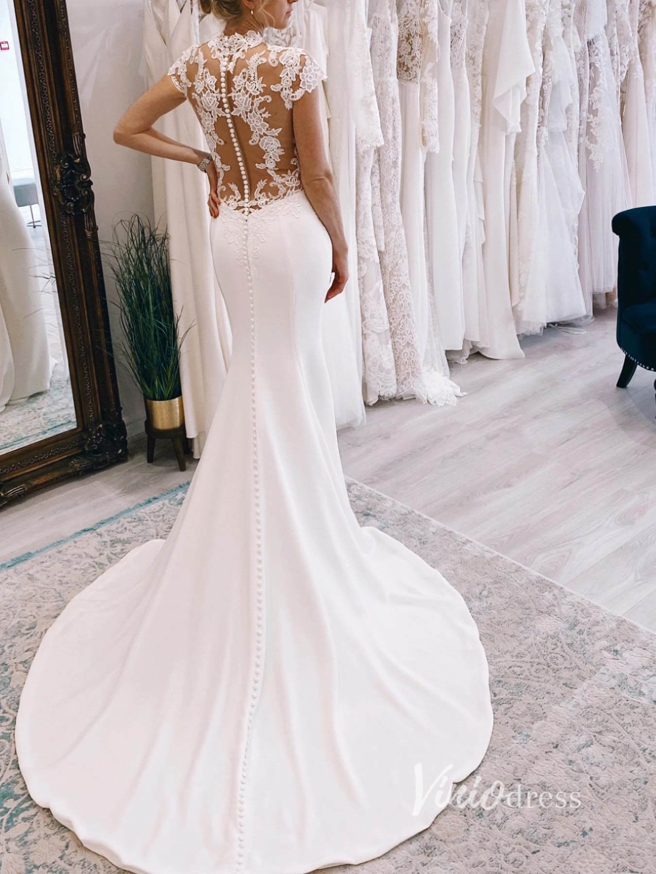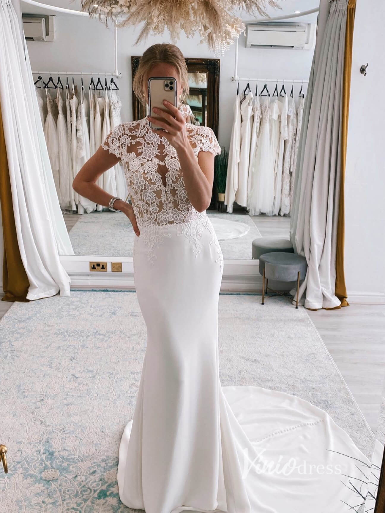 Lace Appliqued Satin Modern Wedding Dresses Cap Sleeve VW2145