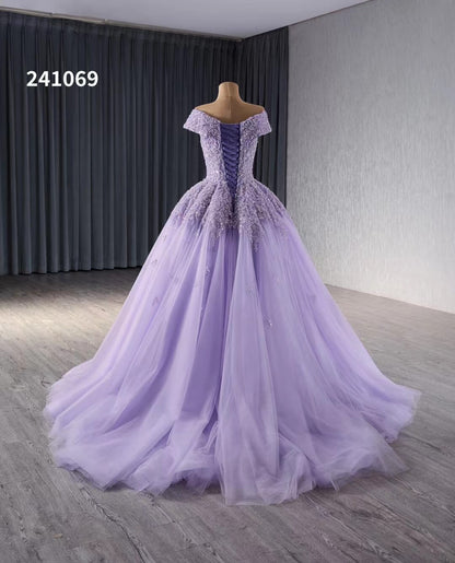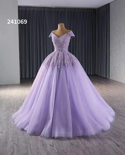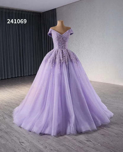 Expertly crafted for your special day, our Lavender Beaded Sequin Wedding Gowns feature an elegant off the shoulder design and intricately beaded sequin bodice. The flowing tulle bottom adds a touch of romance to this stunning Quince Dress. Make an unforgettable entrance with this beautiful gown.