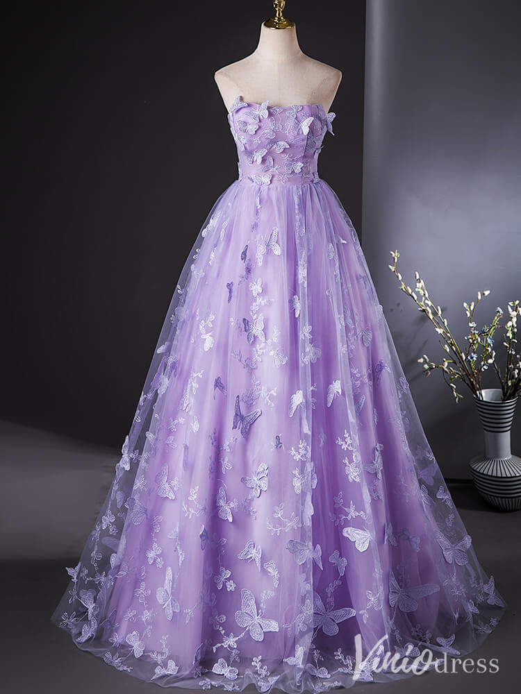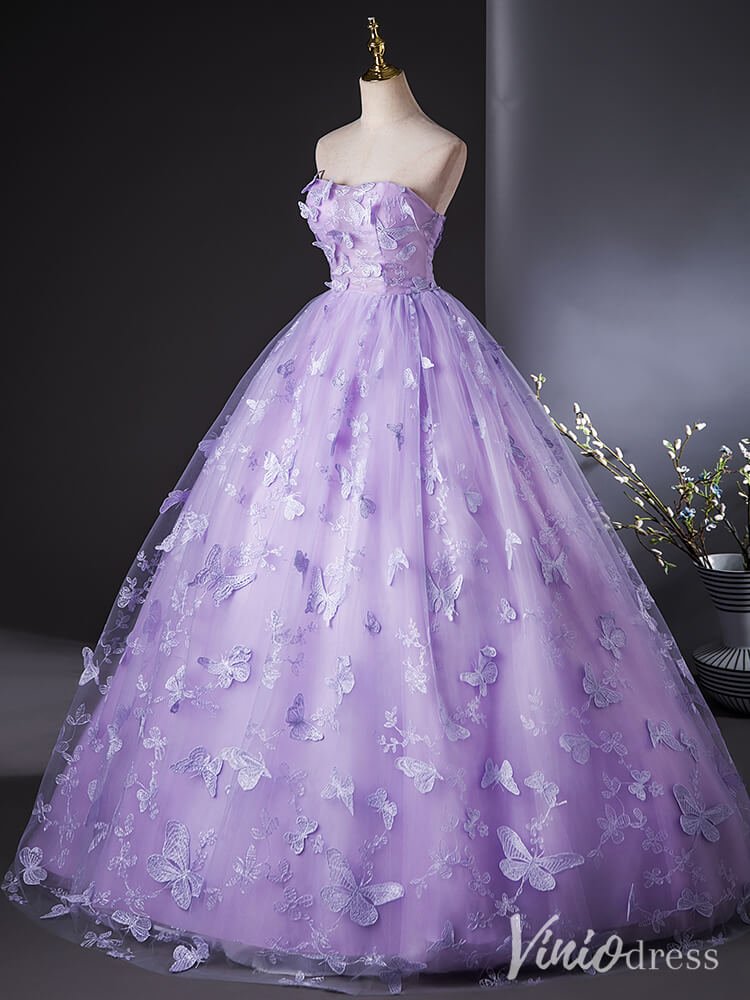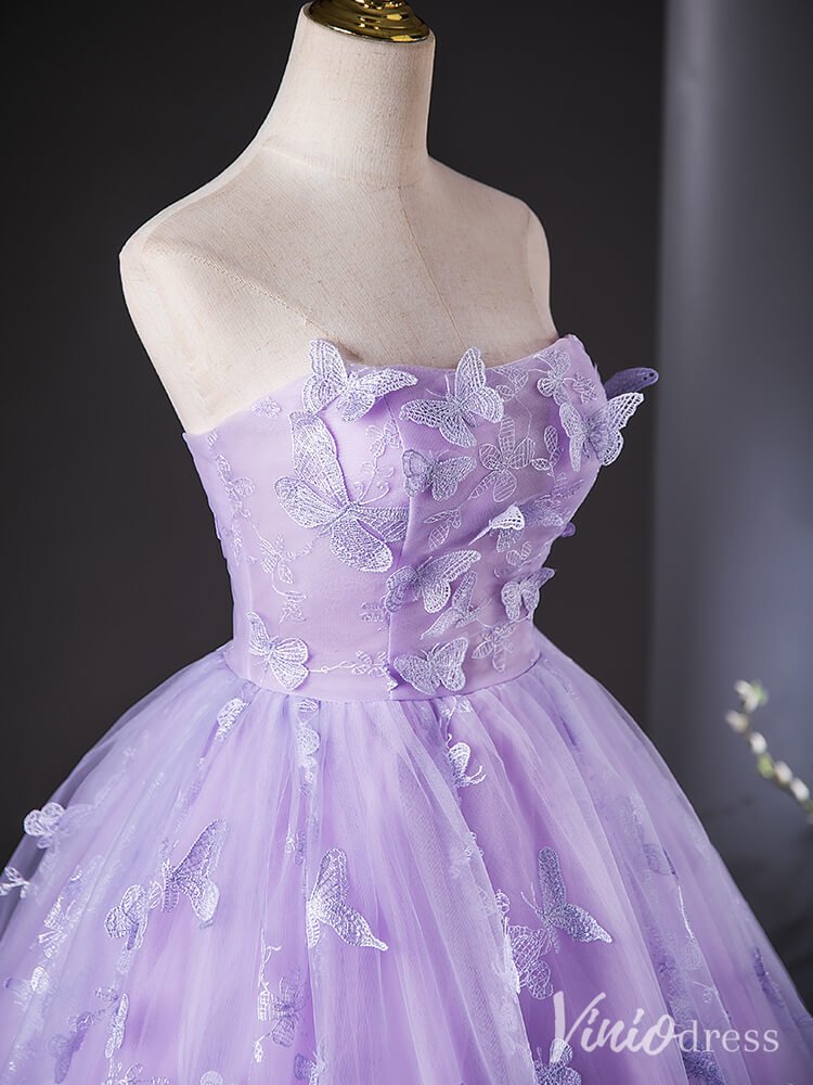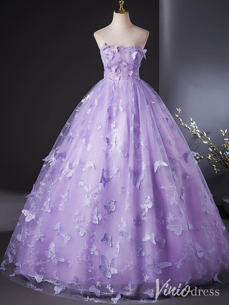 This elegant lavender quinceanera dress is designed with a delicate butterfly lace applique, adding a touch of whimsy to its strapless ball gown style. Perfect for the modern young lady celebrating her special day, this dress exudes grace and sophistication.