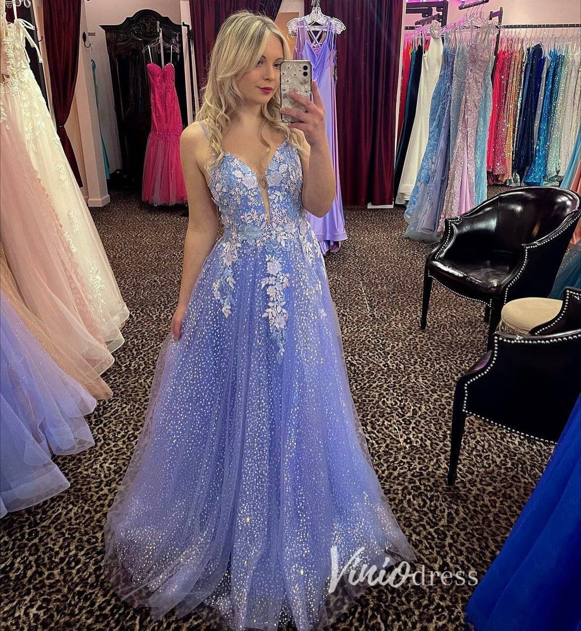 Lace appliqued prom dress featuring spaghetti strap, and plunging v-neck.