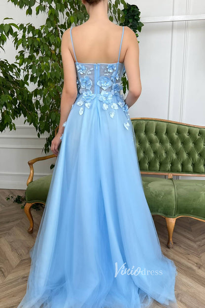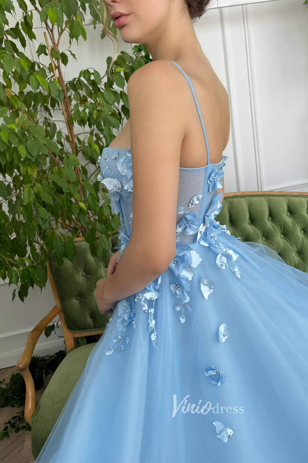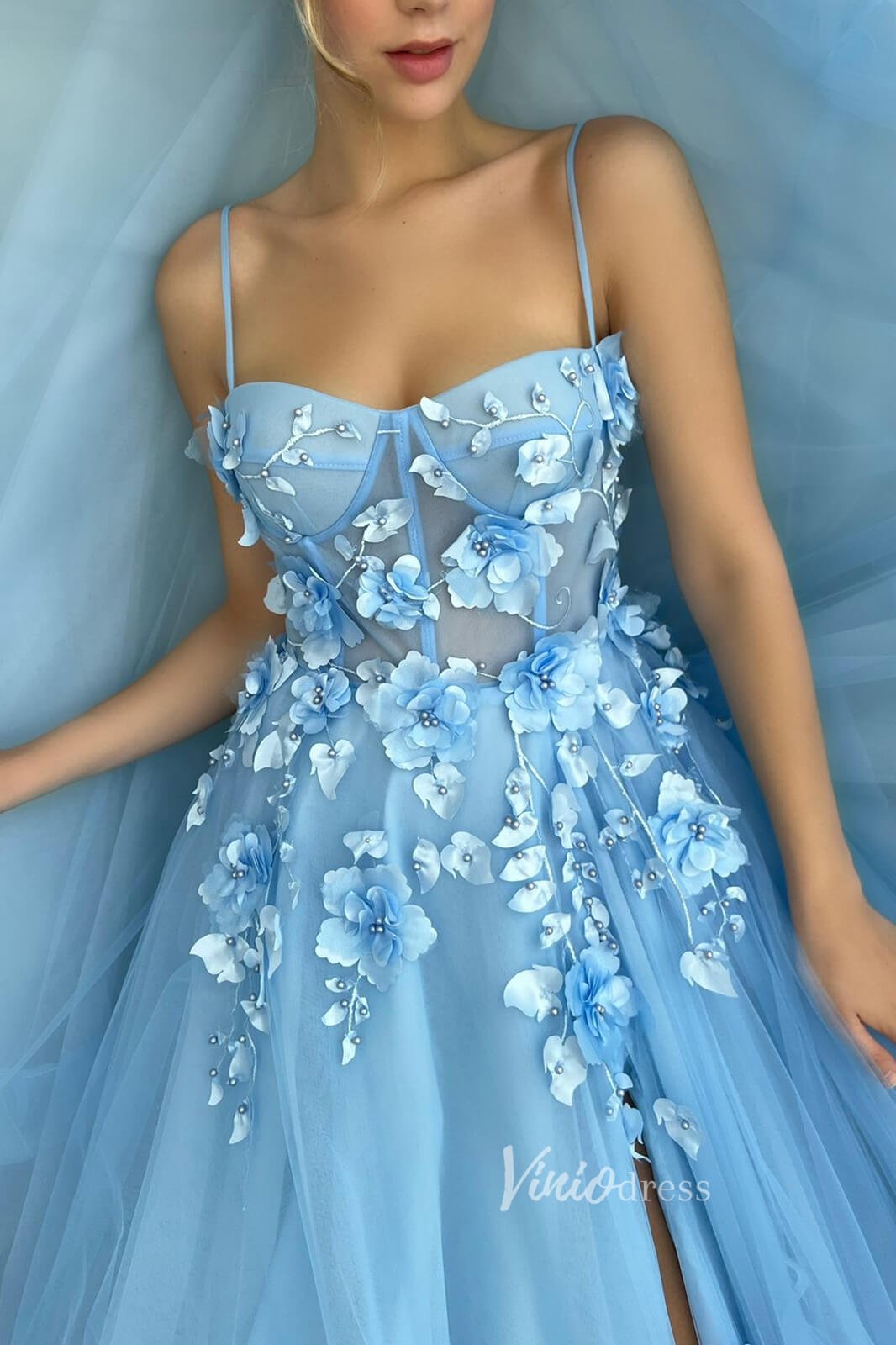 Light Blue 3D Flower Prom Dresses Spaghetti Strap Long Formal Dress FD2978