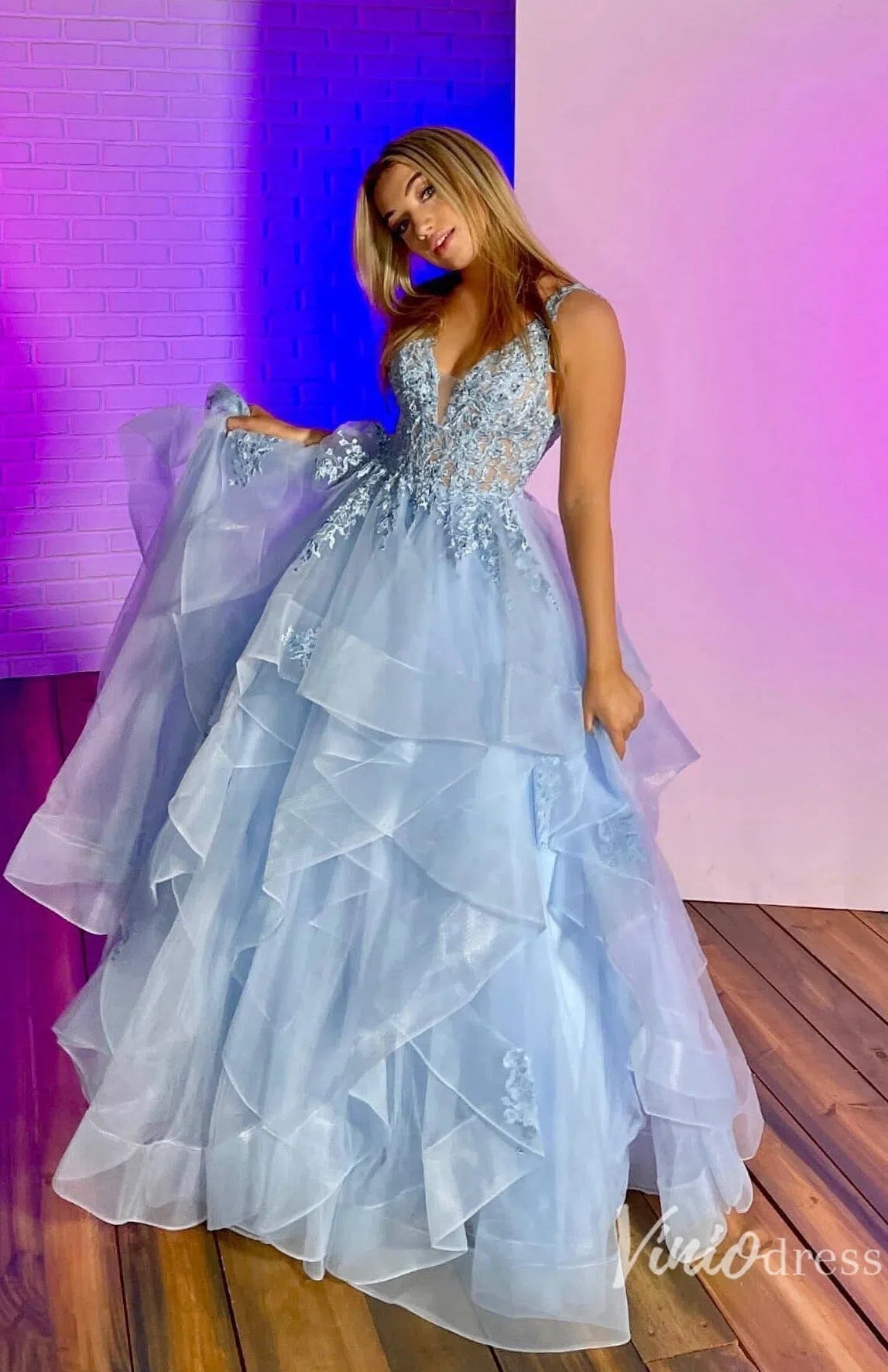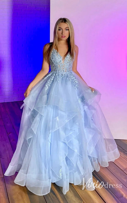 Light Blue Layered Ruffle Prom Dresses Lace Applique Evening Dress FD2915