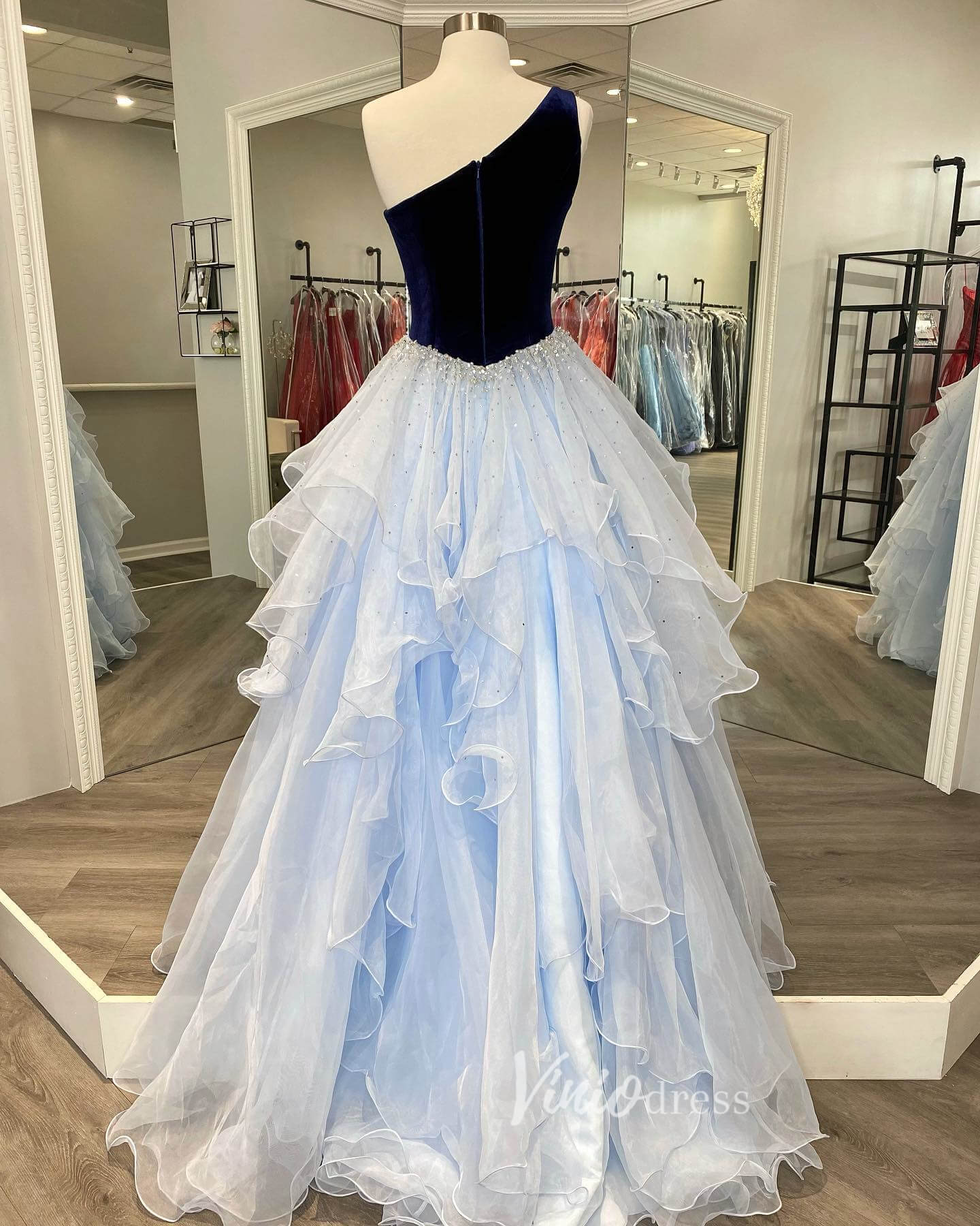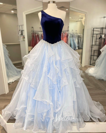 Elegant a-line prom dress features layered ruffle tulle bottom and one shoulder.