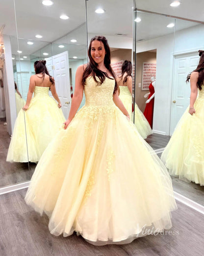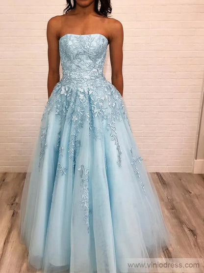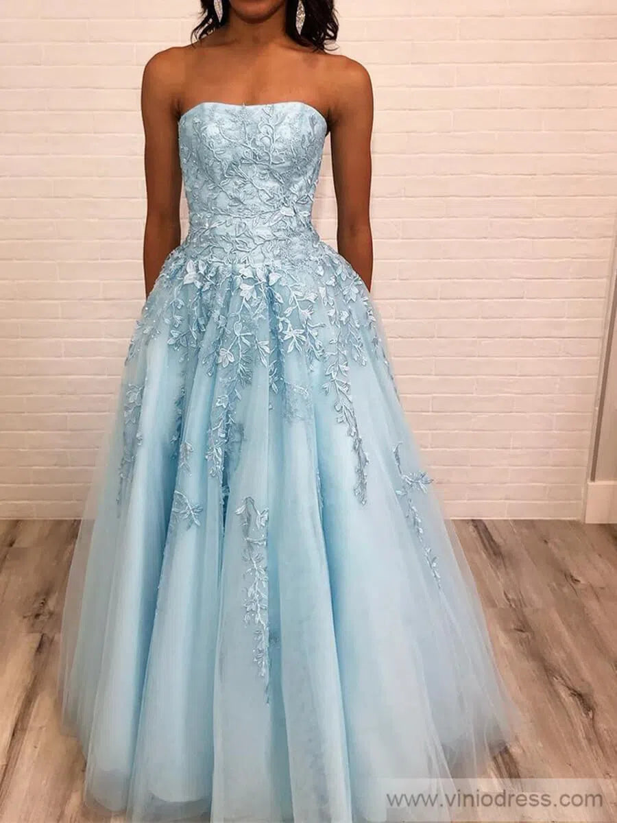 Light BLue Strapless Prom Dresses Lace Appliqued Prom Dress FD1265