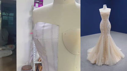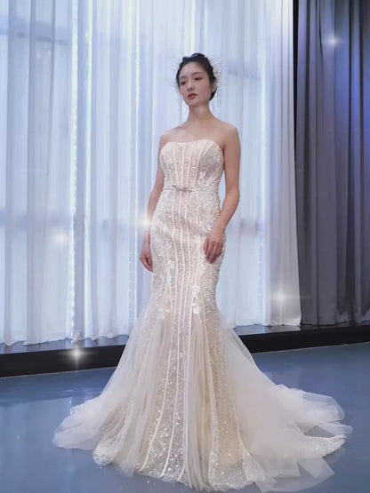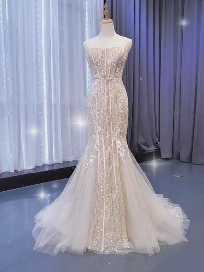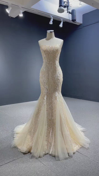 Light Gold Mermaid Wedding Dresses Strapless Beaded Prom Dress 67339