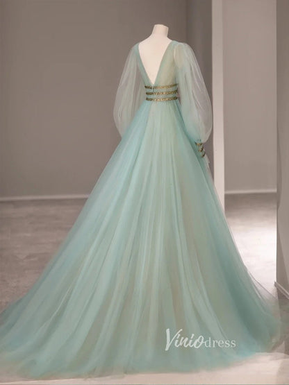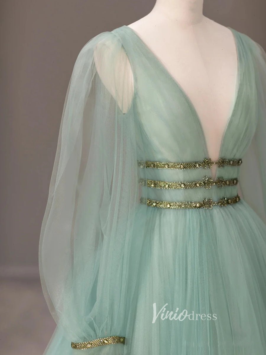 Light Green Tulle Prom Dresses Long Sleeve Evening Dress FD3223