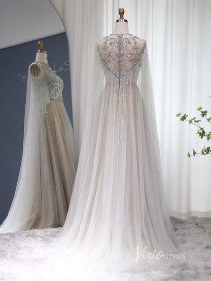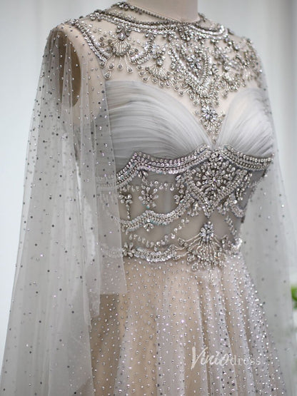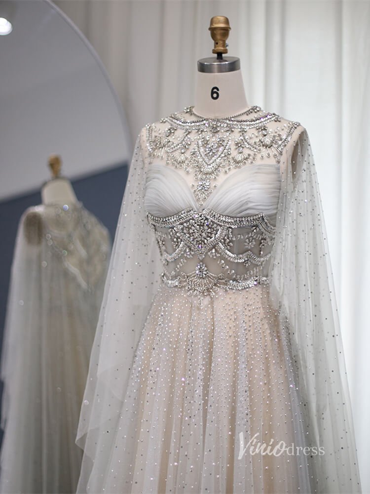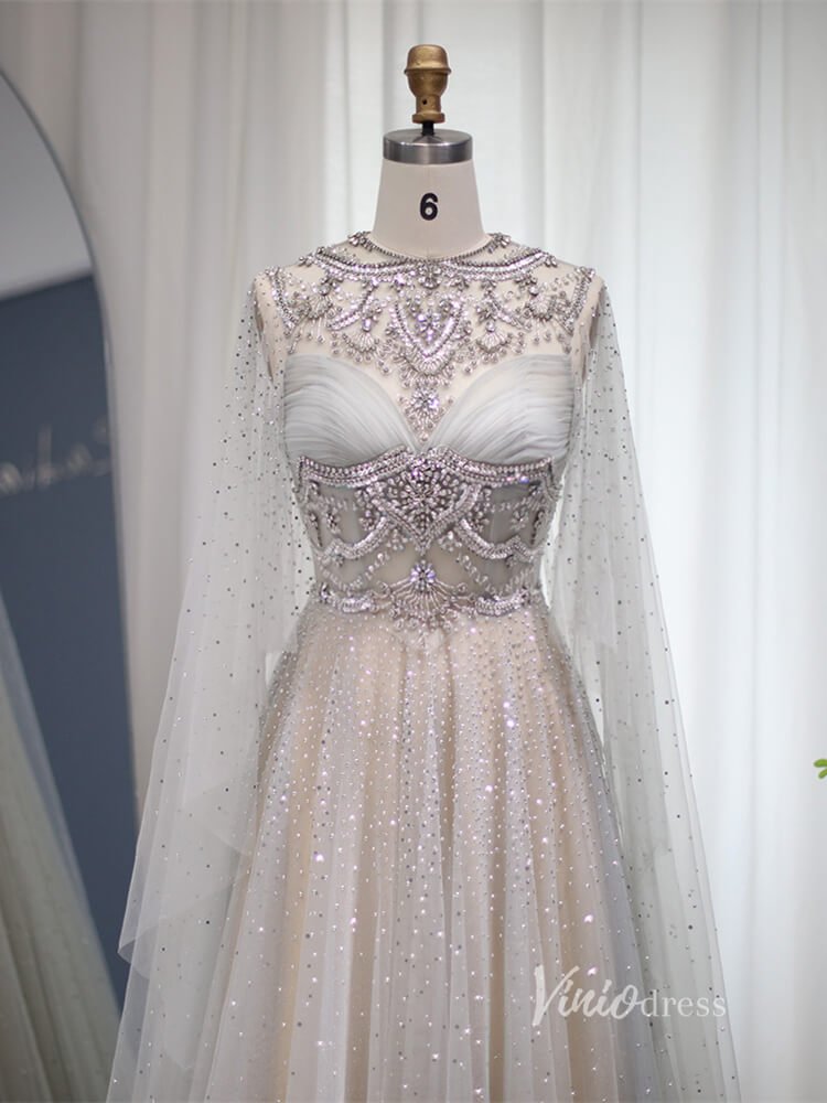 Silver Beaded A-line Prom Dresses Cape Sleeve FD2612