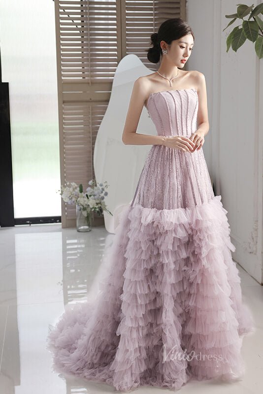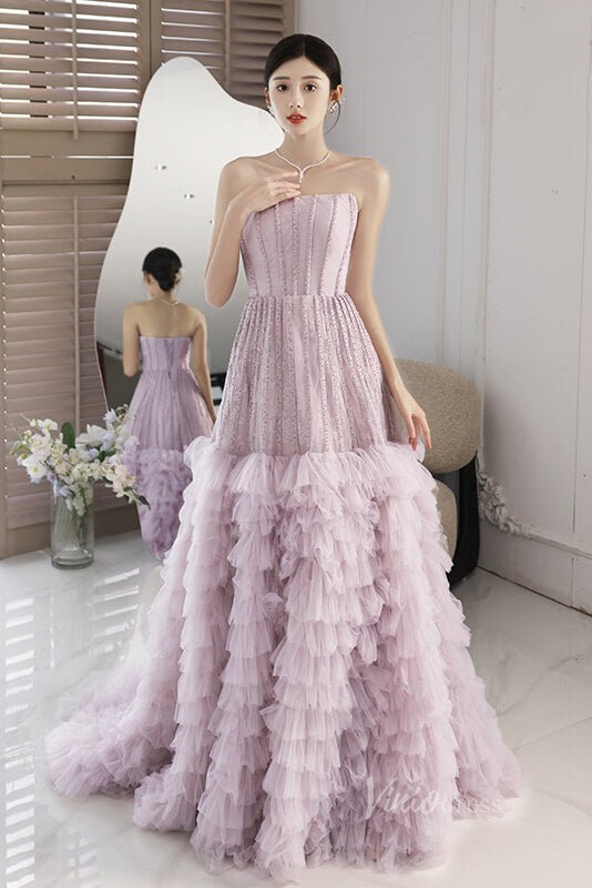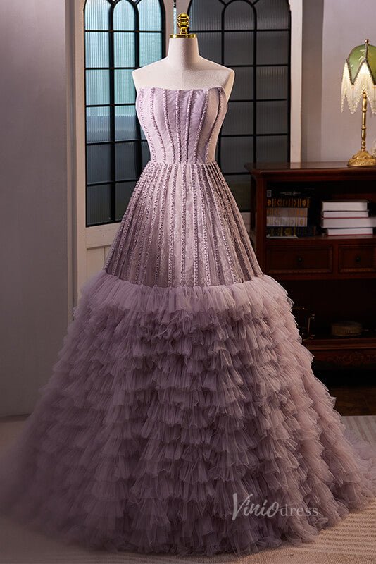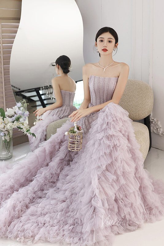Be the belle of the ball in this exquisite Lavender Ruffled Prom Dress. Strapless and beaded for a sophisticated sparkle, it radiates elegance and grace. The sumptuous ruffles add a touch of drama to complete this timelessly classic evening dress.