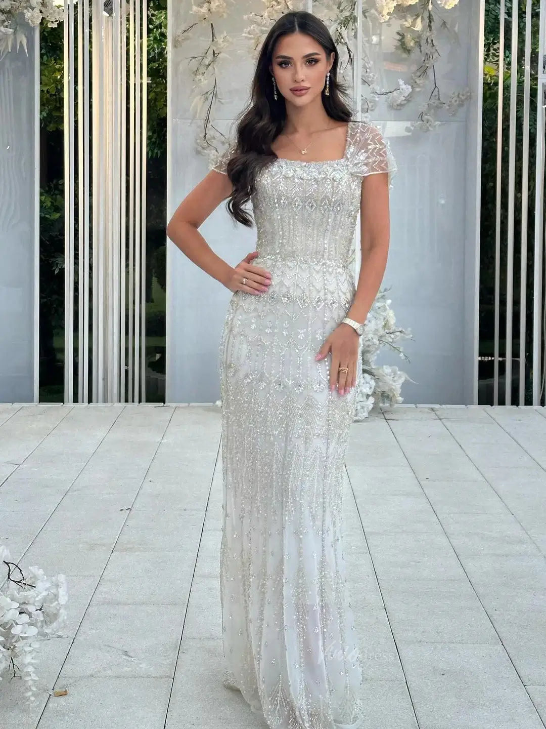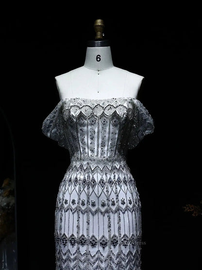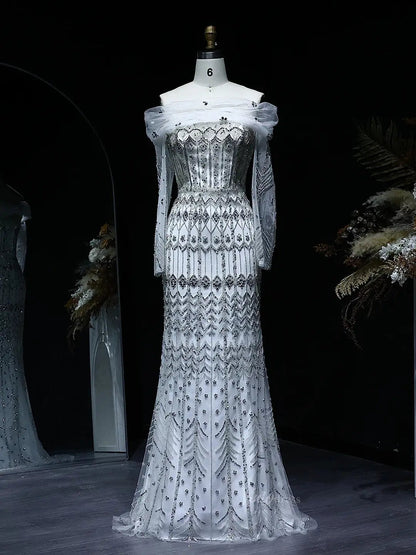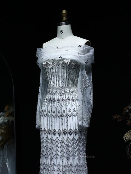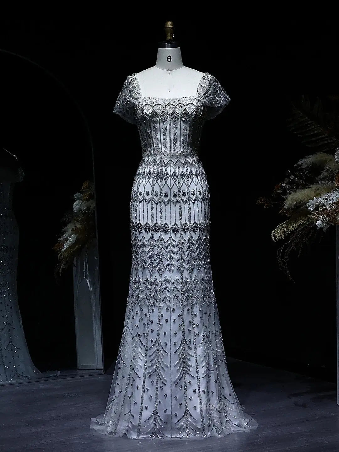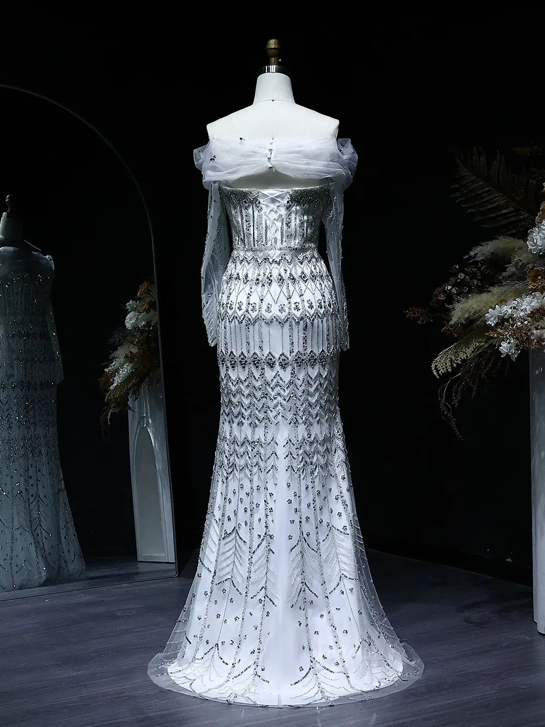 Introducing the Beaded Silver Prom Dresses! This stunning formal dress features intricate vintage beading for a touch of elegance. With two versions of sleeve types available, this dress can be worn for any occasion and is sure to make you stand out. Add this timeless piece to your wardrobe today!